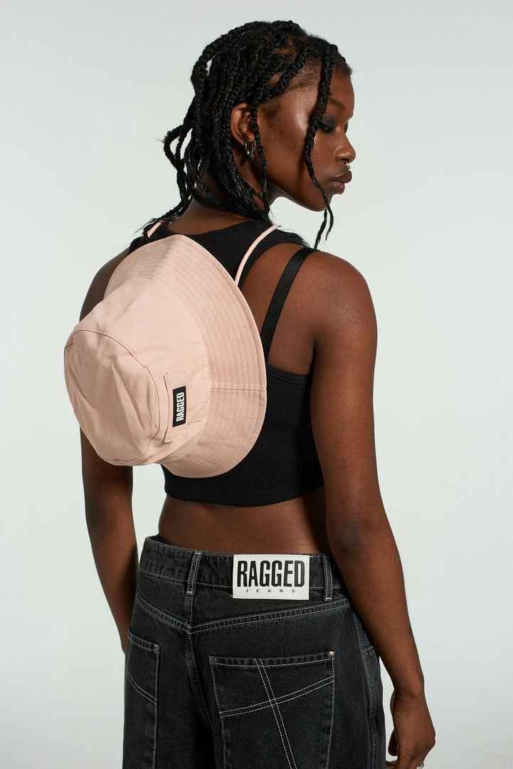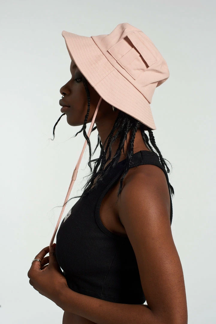 The Ragged Priest pink denim cargo utility design fisherman bucket hat.