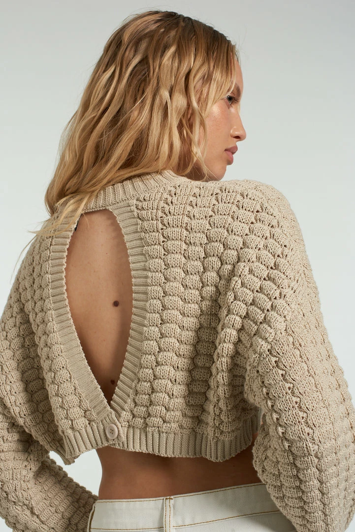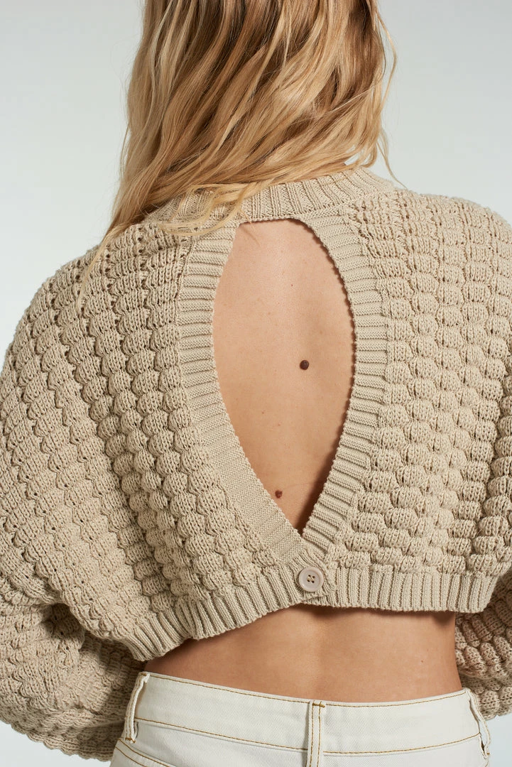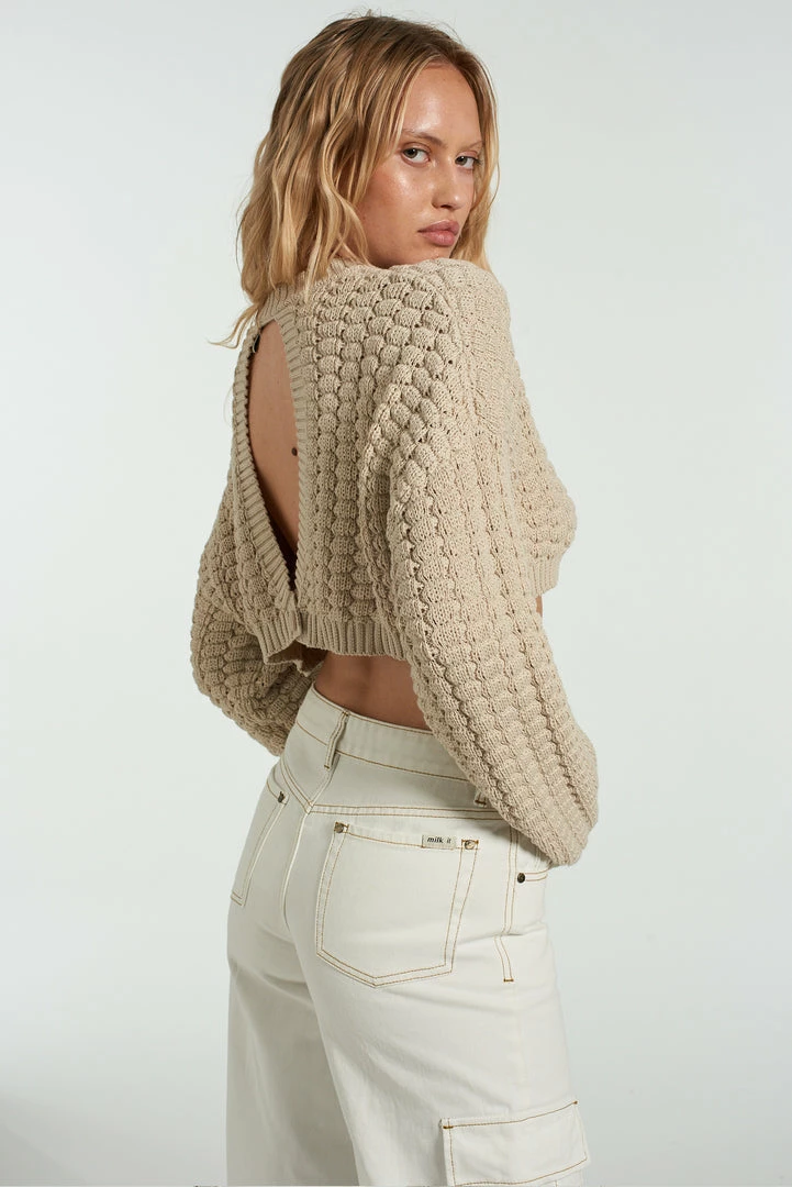 The Glare knit is our beige knitted cropped jumper with open back detail.