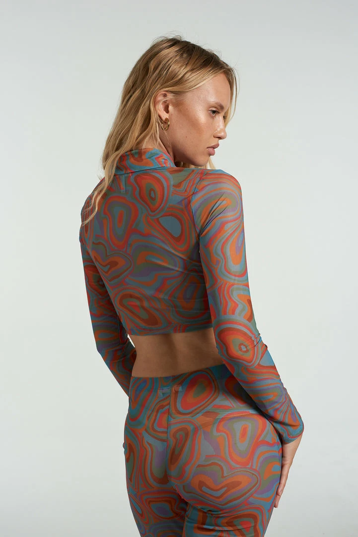 The Hue top is our mesh long sleeved, collared cropped top with multicoloured crystal print.