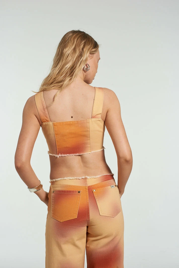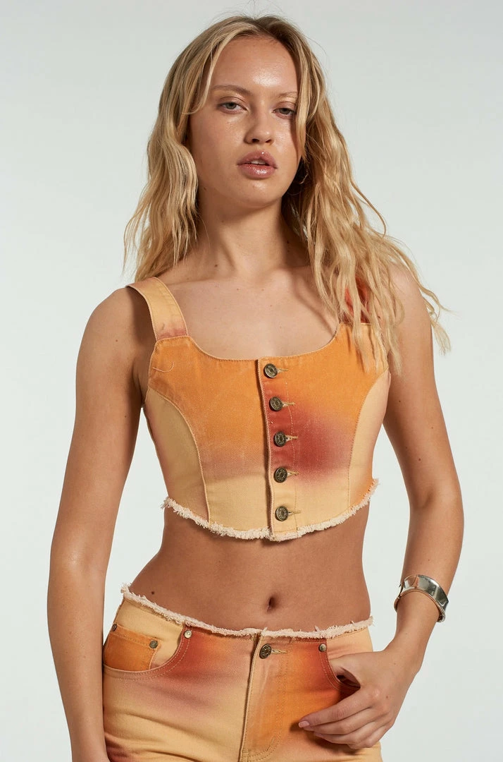 The Mirage top is our orange tie-dye look patterned corset style crop top with gold button up central fastening.