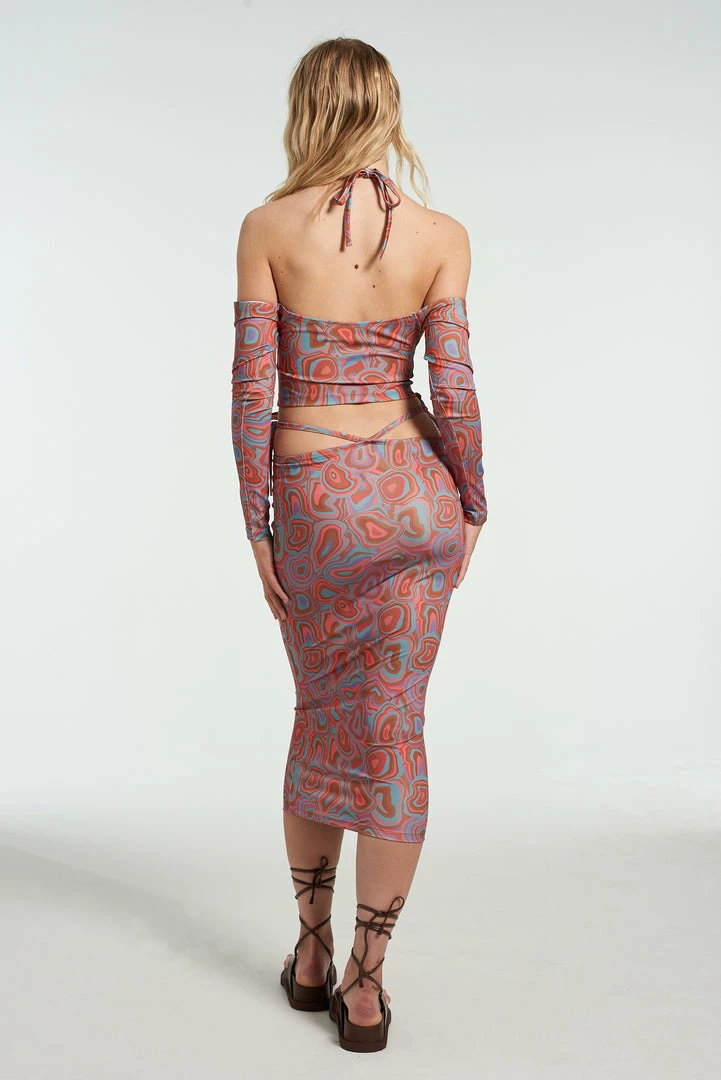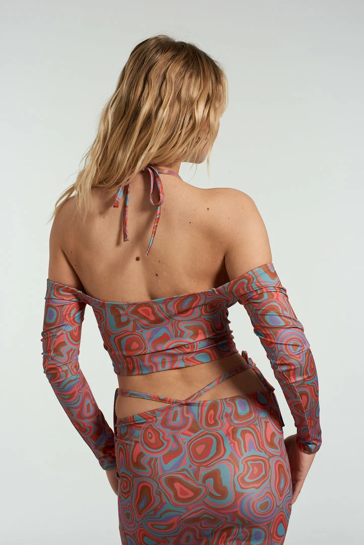 The Sierra Top is our cut out crop top with with halter neck tie up, central waist tie detail, multicoloured crystal print and long sleeves with a cold shoulder.