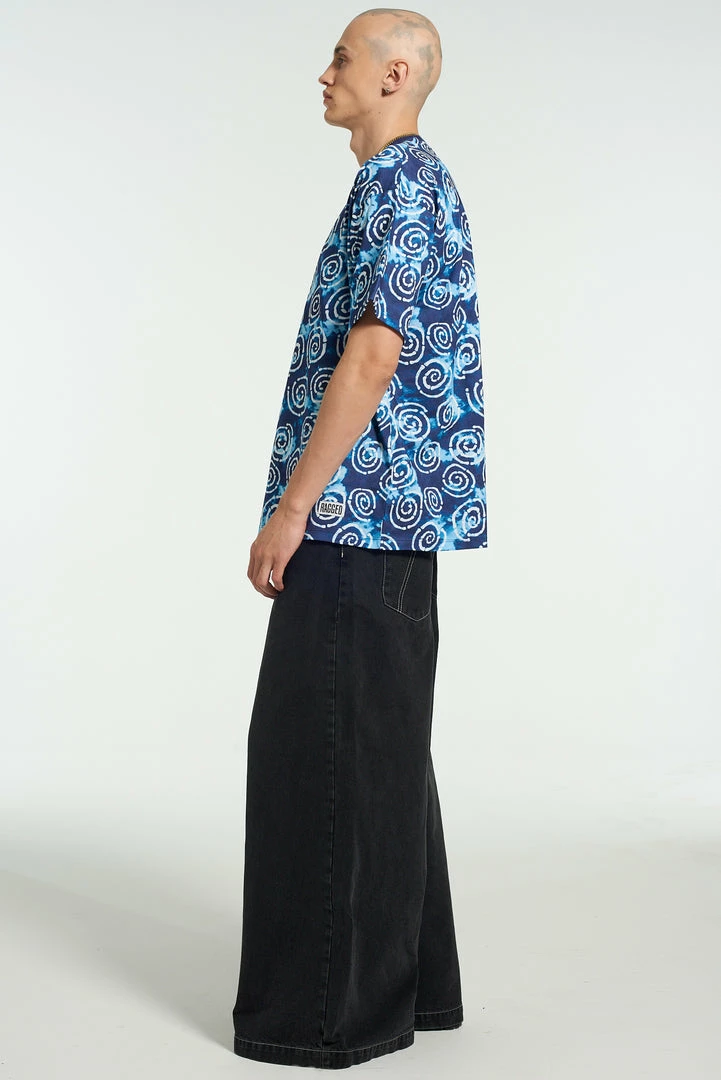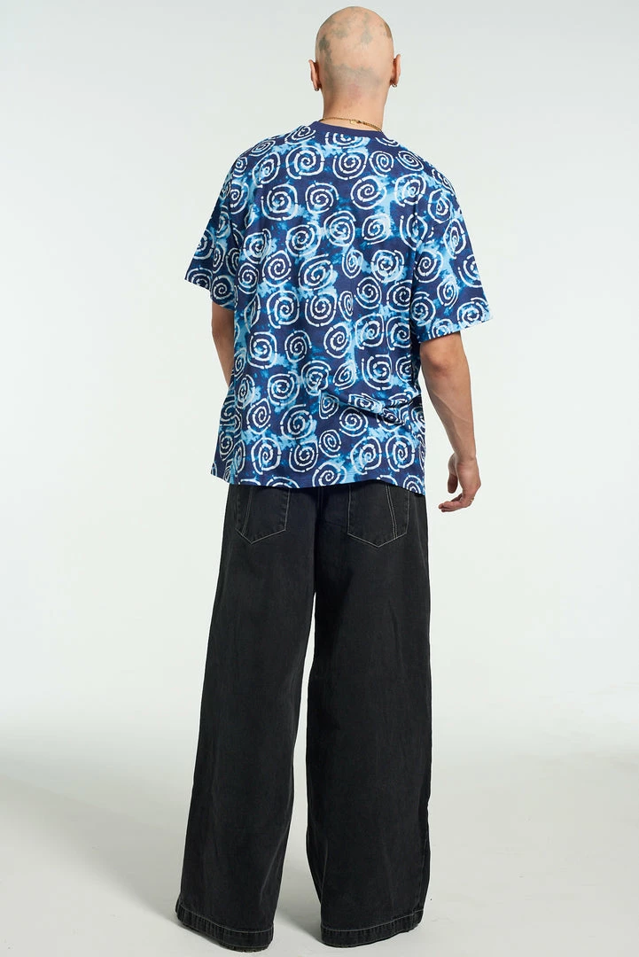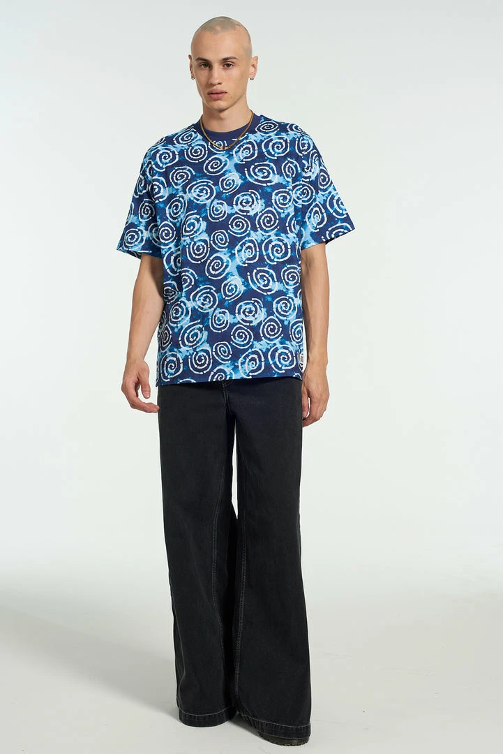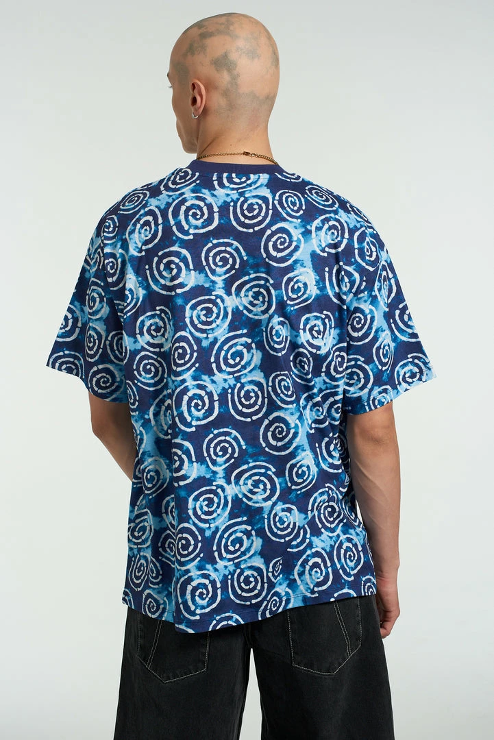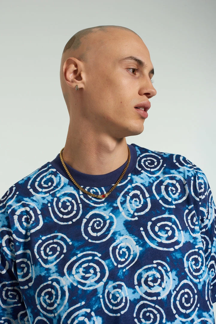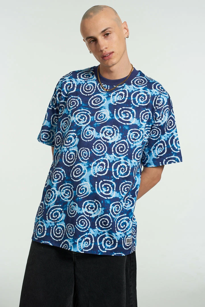 The Ragged Priest men’s Batik inspired swirl print t-shirt in navy and white.