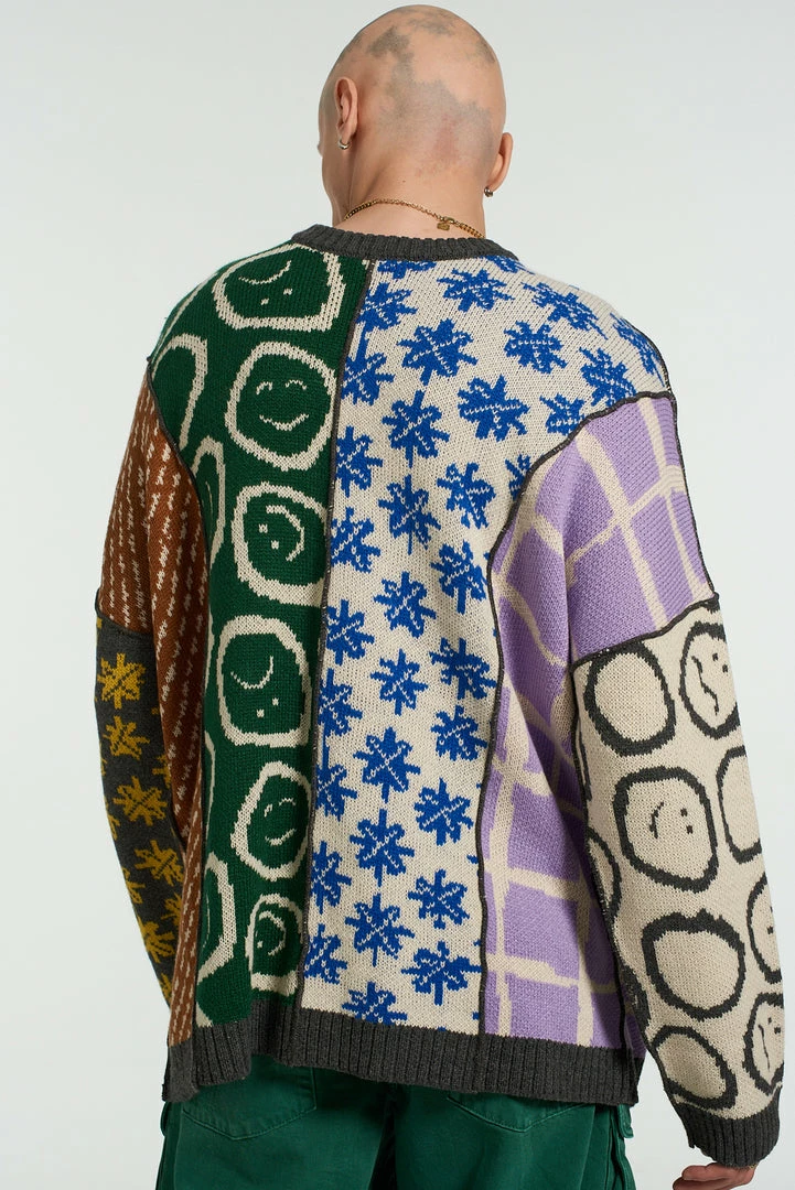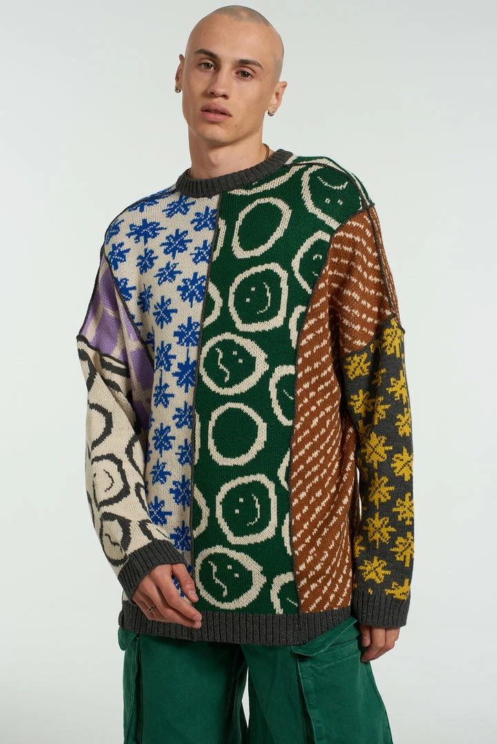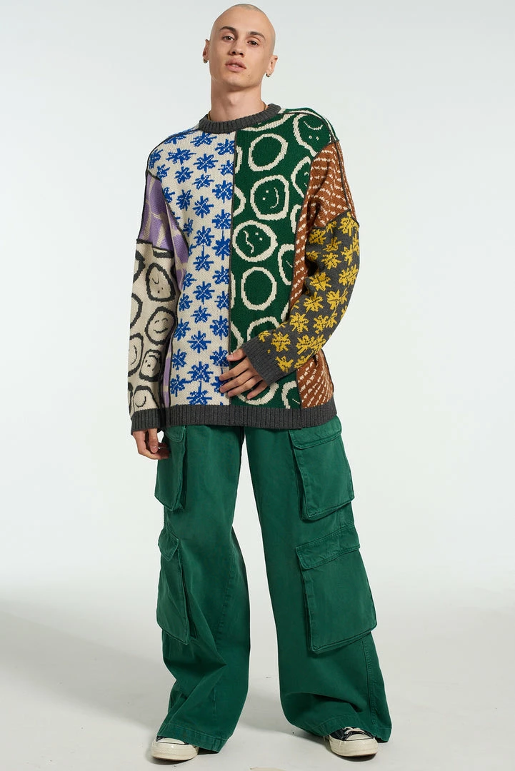 The Ragged Priest men’s knitted patchwork jumper with Batik inspired prints.