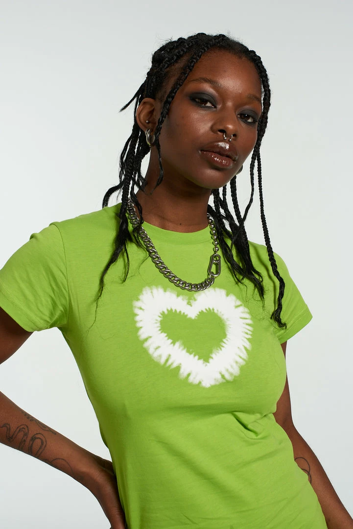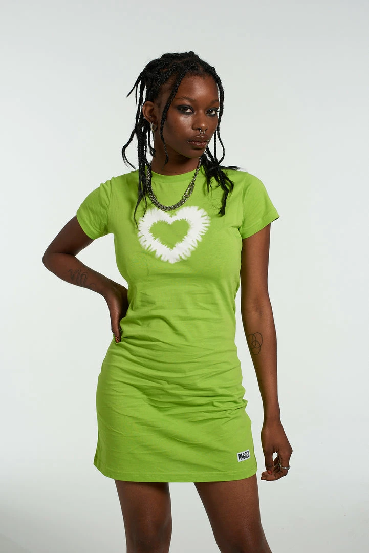 The Ragged Priest Lime green t-shirt dress with central white Batik inspired heart print.