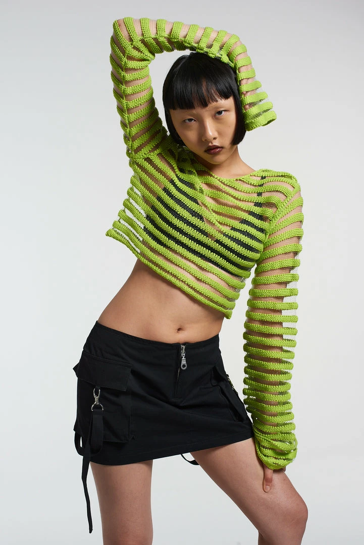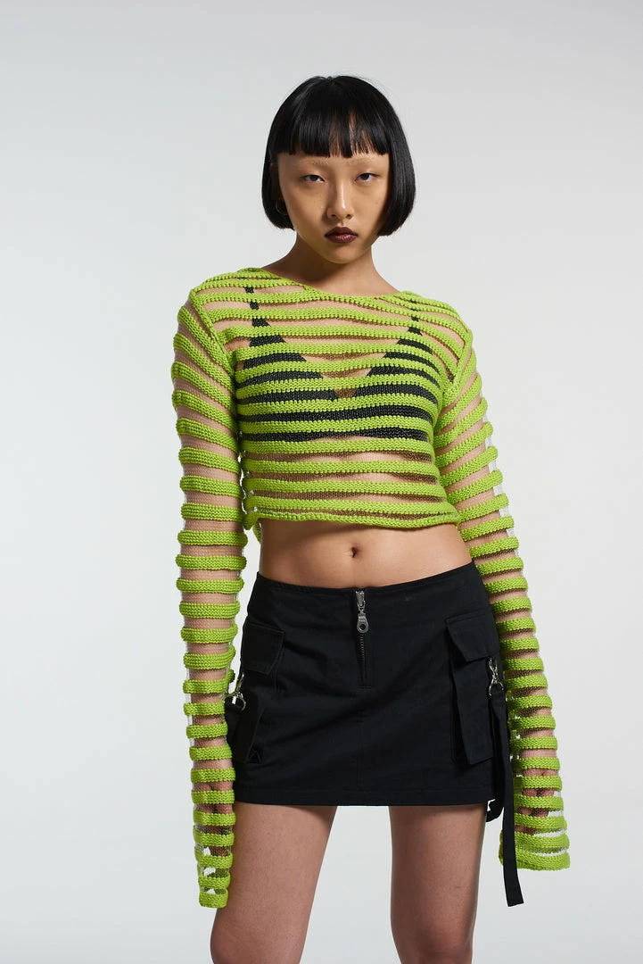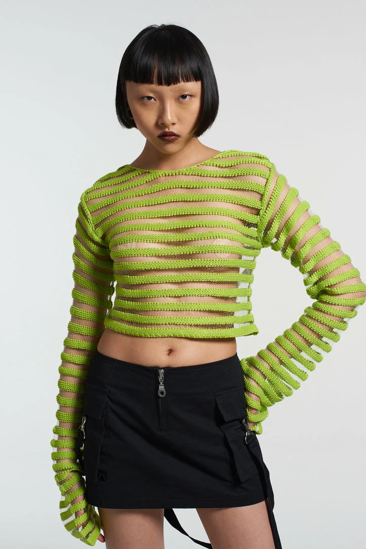 The Ragged Priest lime green knitted long sleeve stripe top with sheer transport yarn stripe detail.