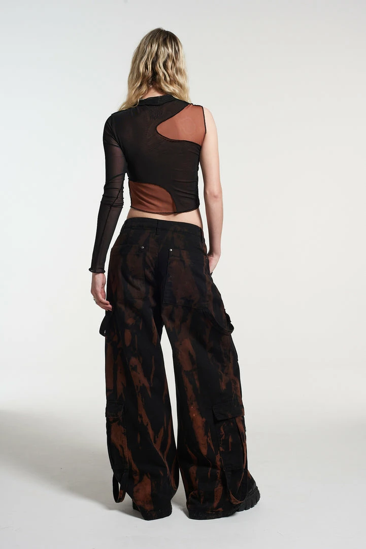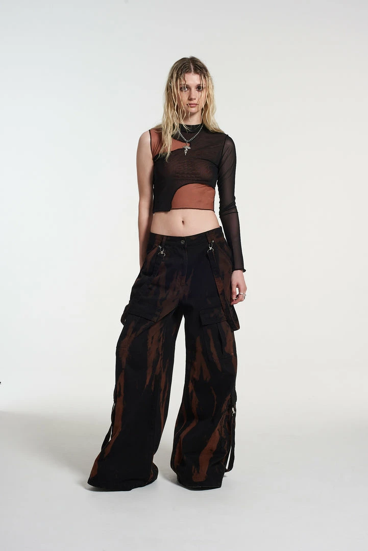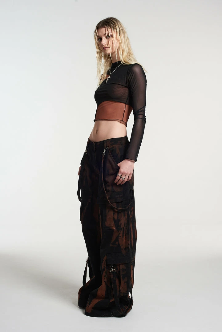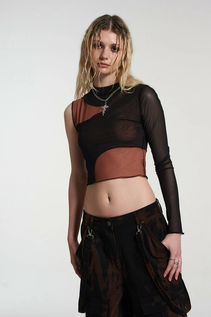The Ragged Priest double mesh layered crop top. Brown mesh main body with an asymmetric black mesh overlay.