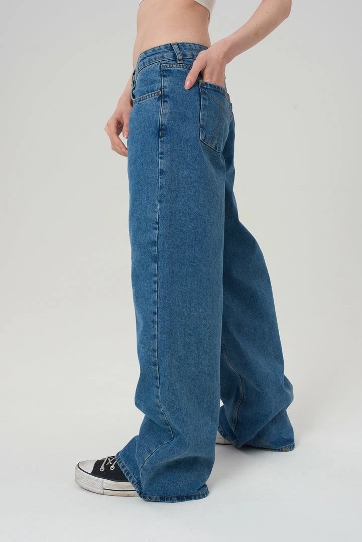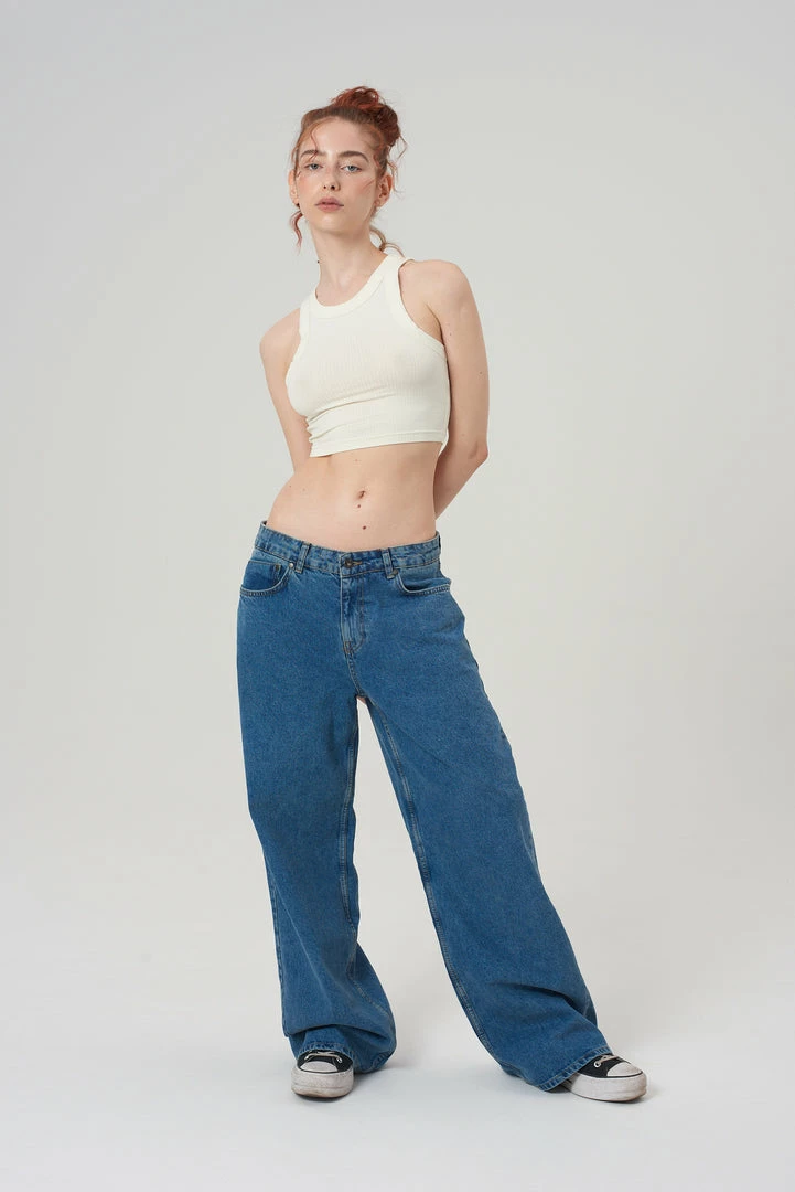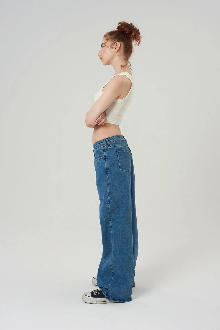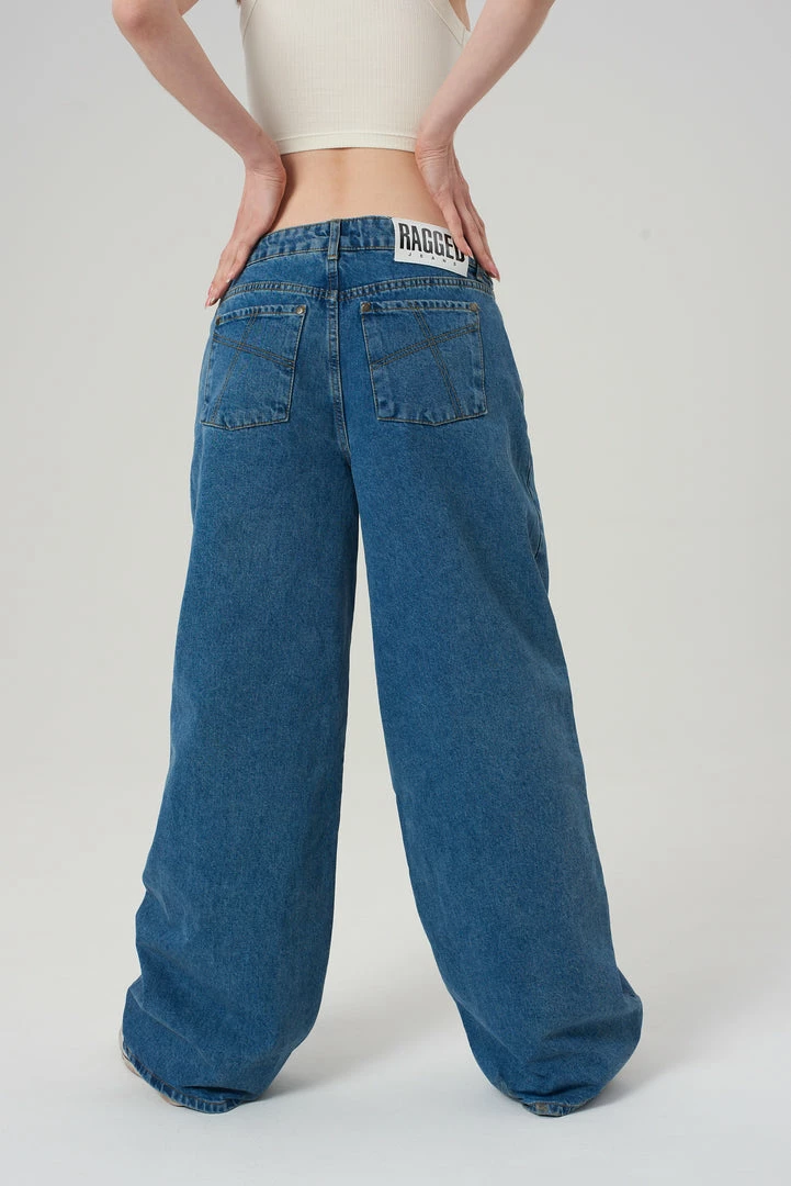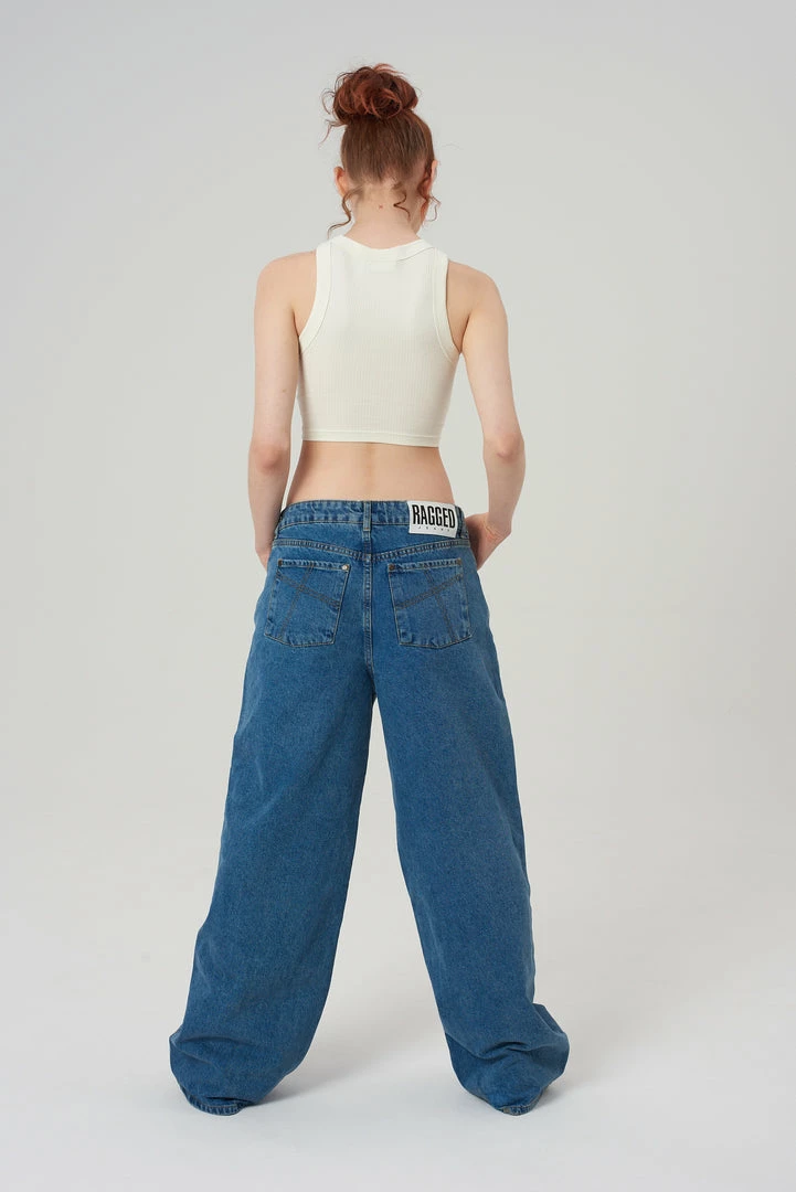 Ragged Jeans low rise baggy wide leg jeans in mid blue with “RAGGED Jeans” belt loop tab.