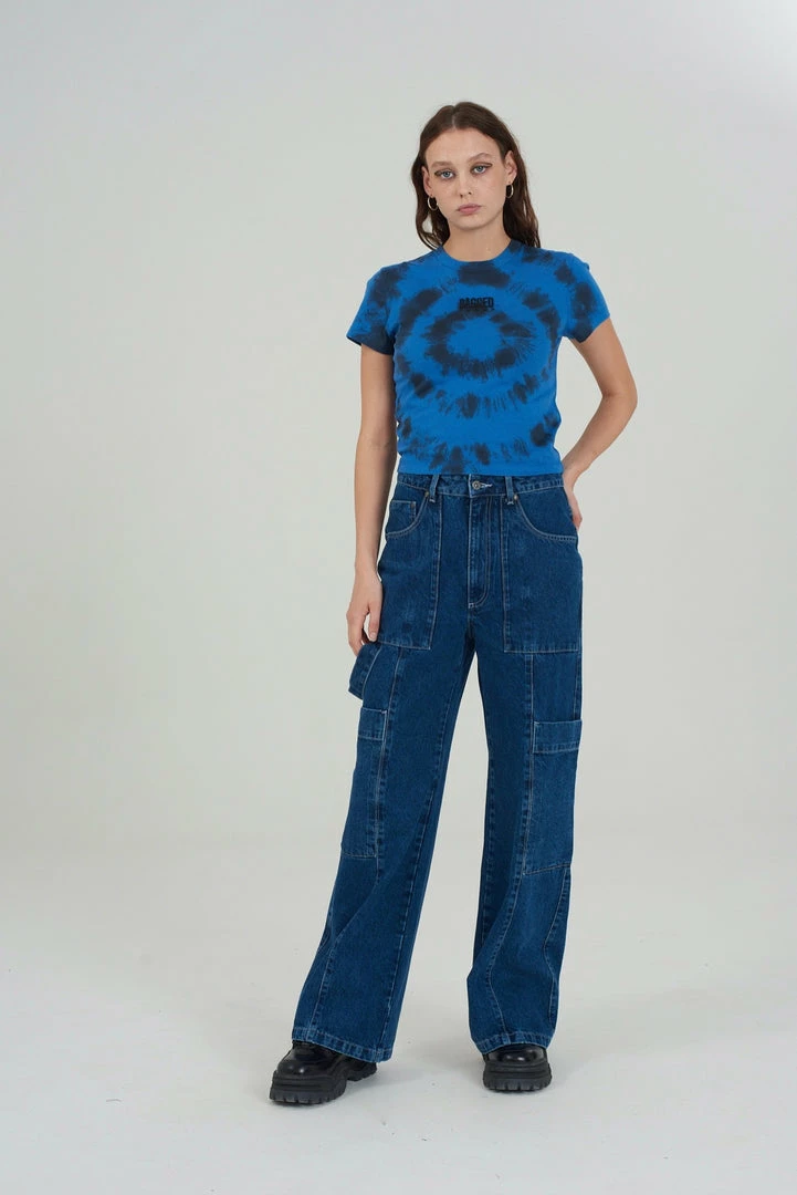 Ragged Jeans blue circle tie dye short sleeve ringer tee.