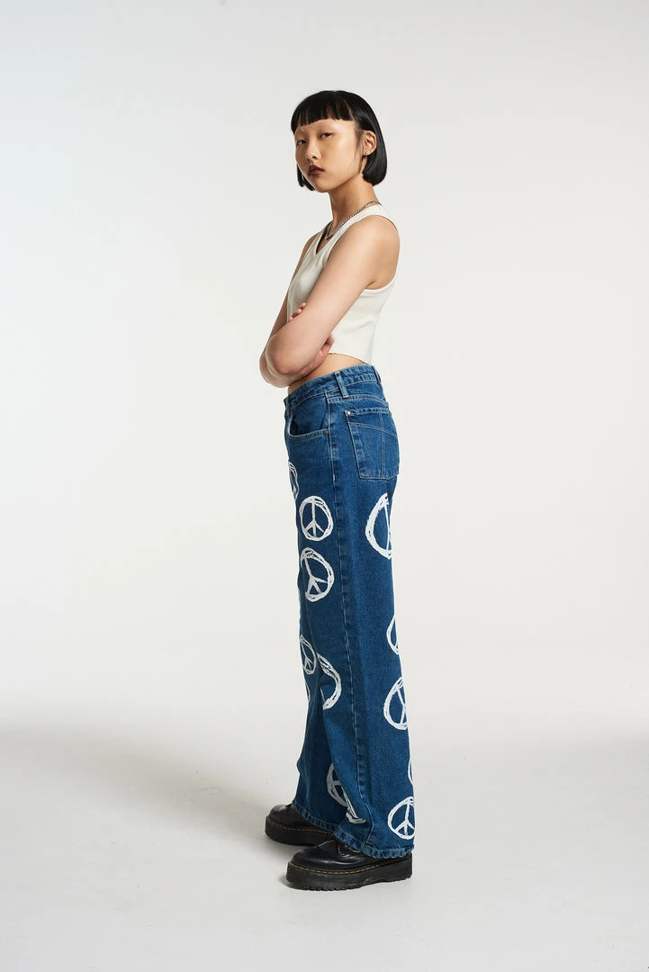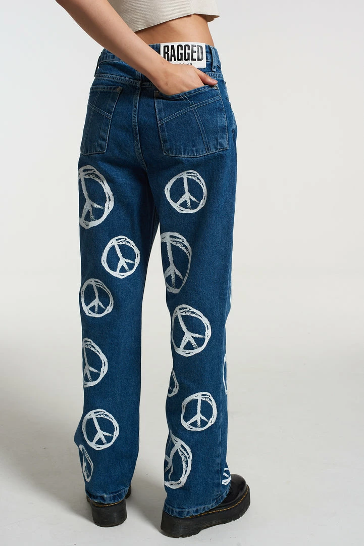 The Ragged Priest white peace sign printed jeans in scribble hand drawn style on our classic mid blue dad jeans