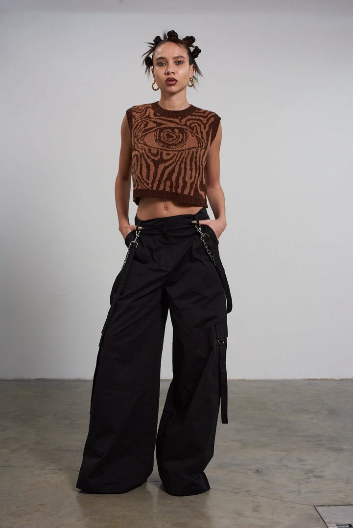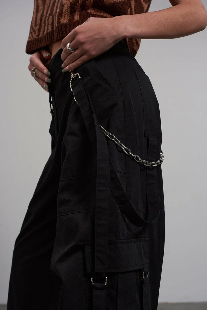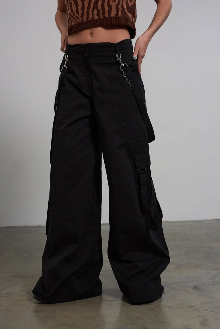 The Ragged Priest black super wide leg combat pant with straps and chains detail.
