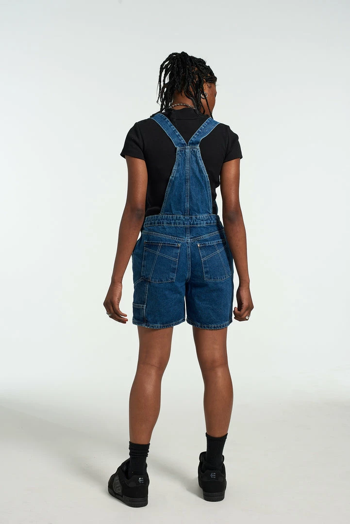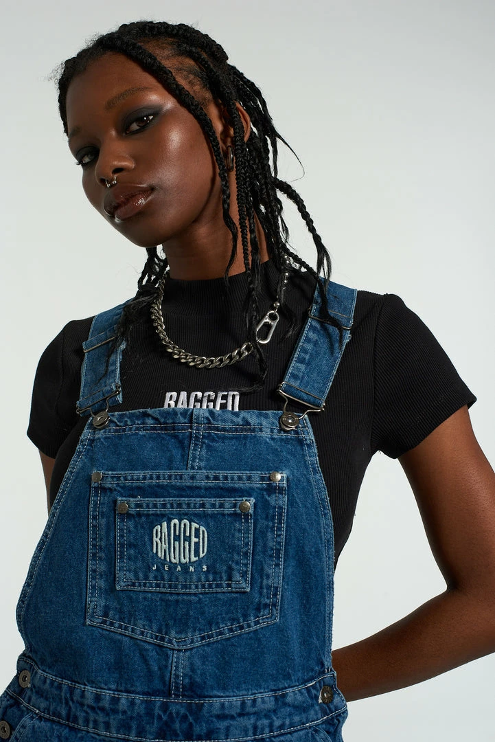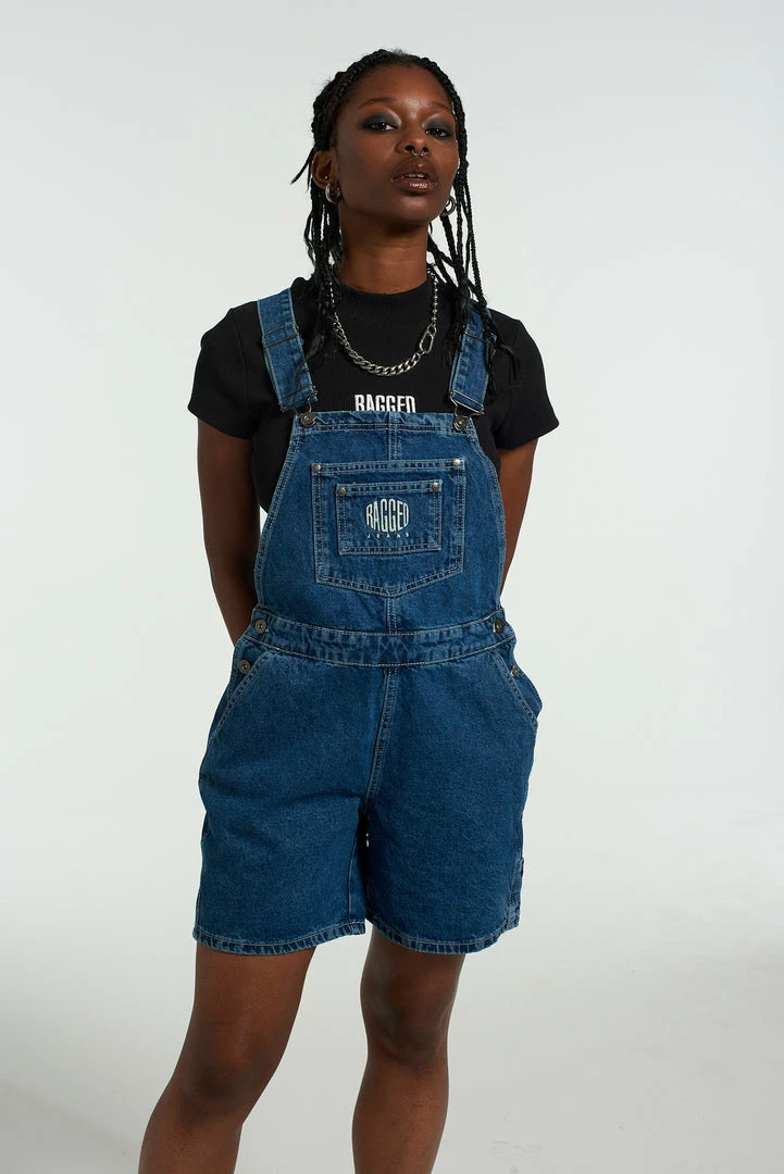 The Ragged Priest blue denim overall shorts with central “RAGGED Jeans” embroidered logo.