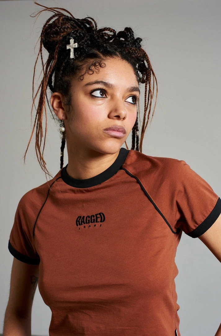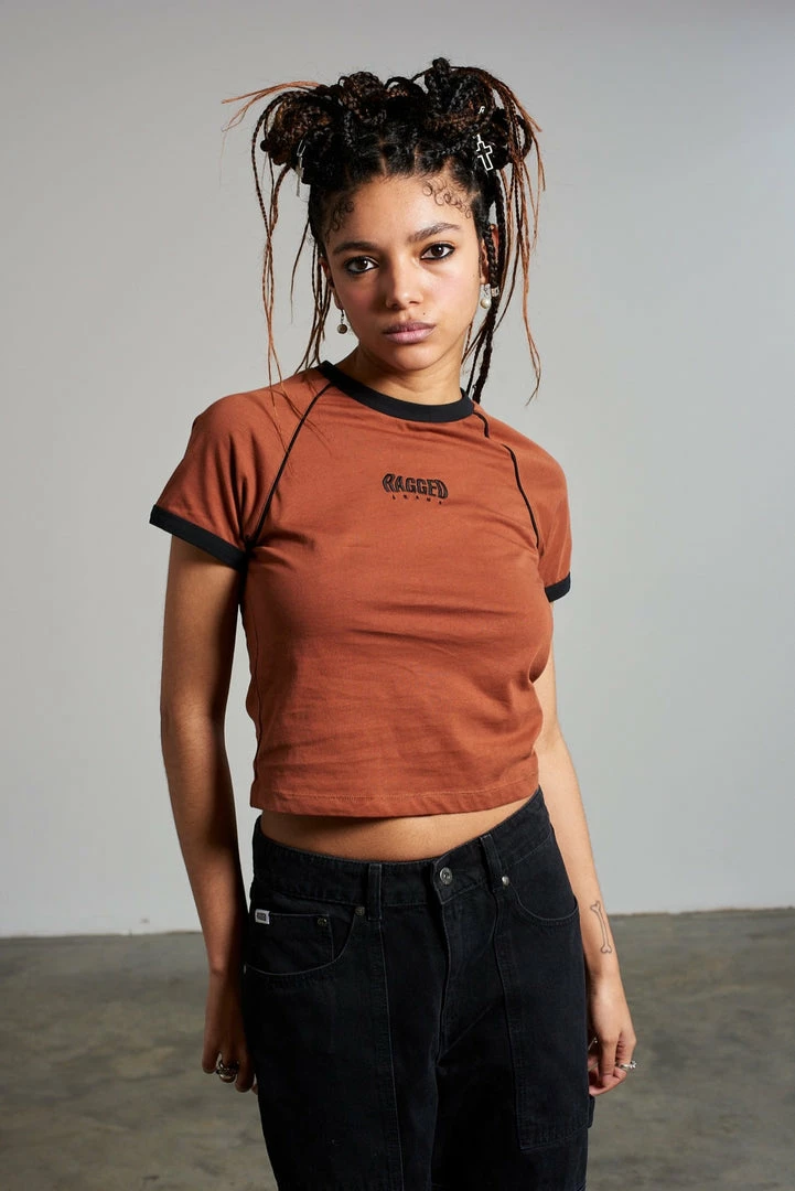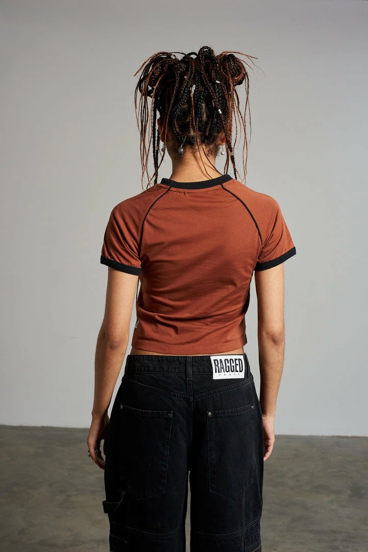 Ragged Jeans brown short sleeve top with raglan sleeves, black trim, and black ‘Ragged Jeans’ embroidered logo.