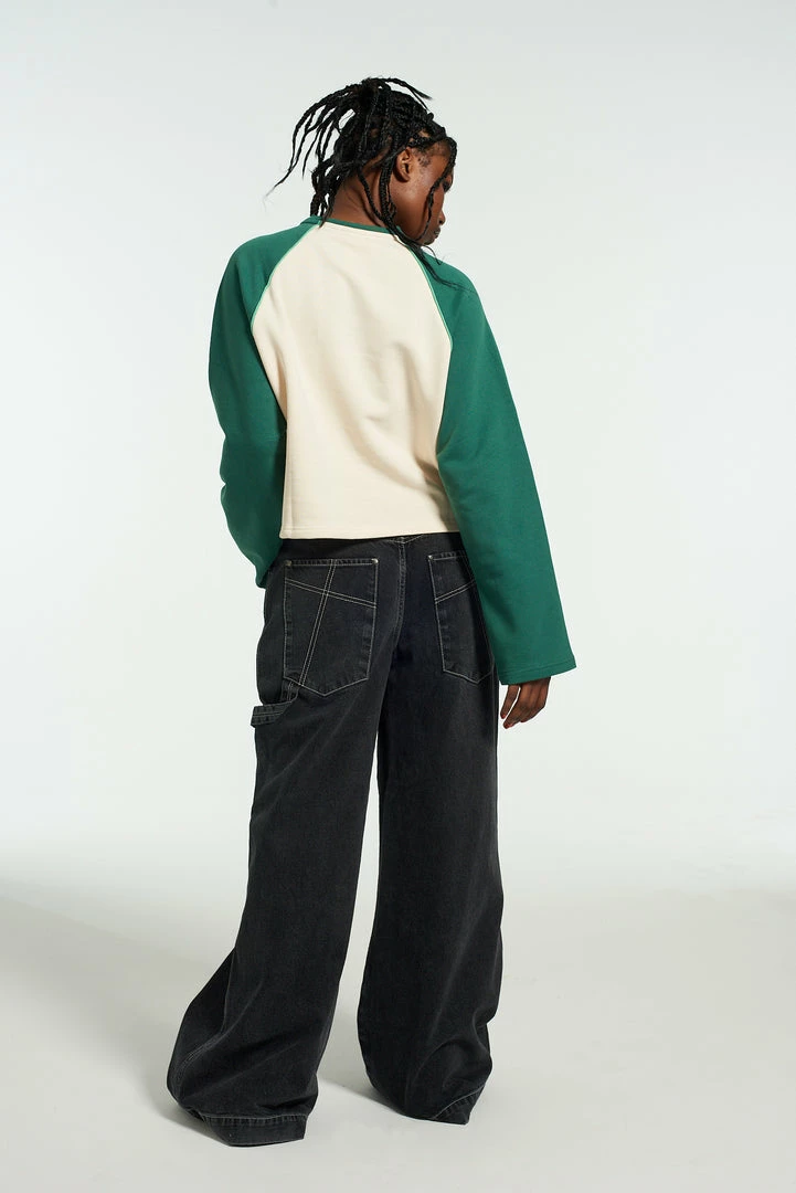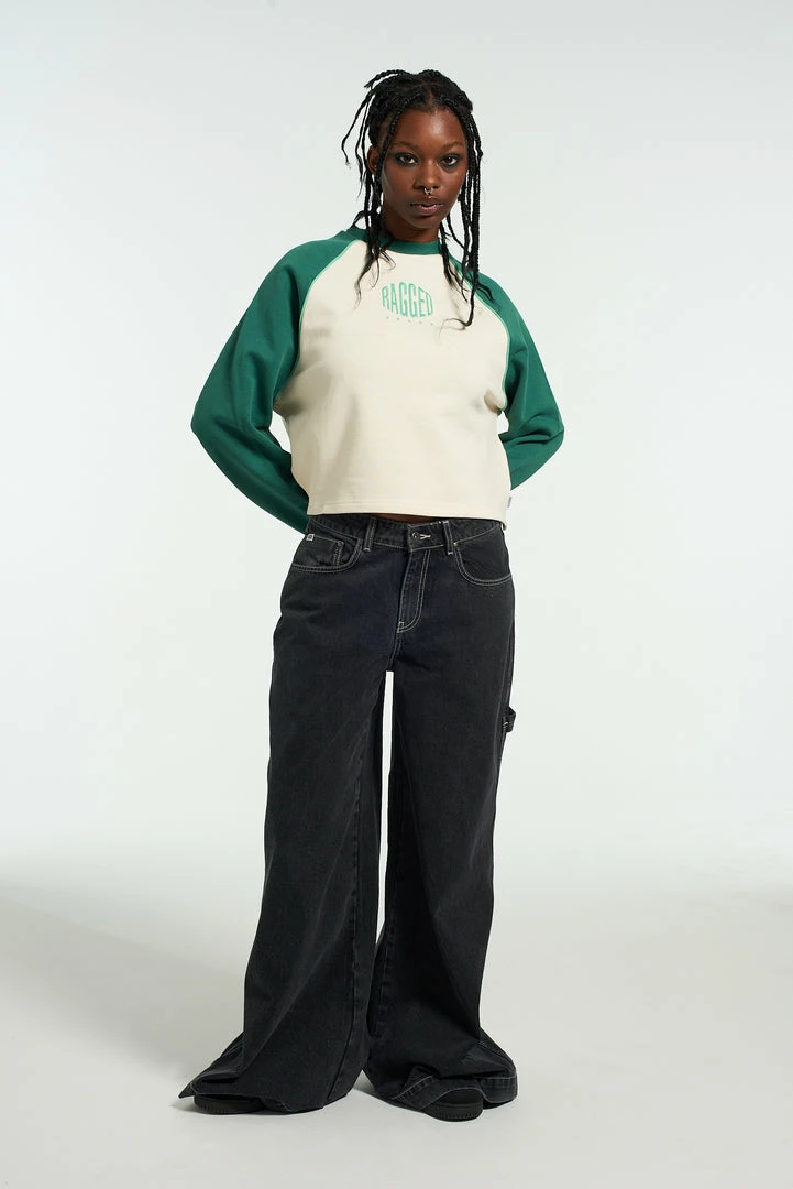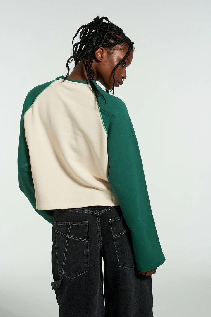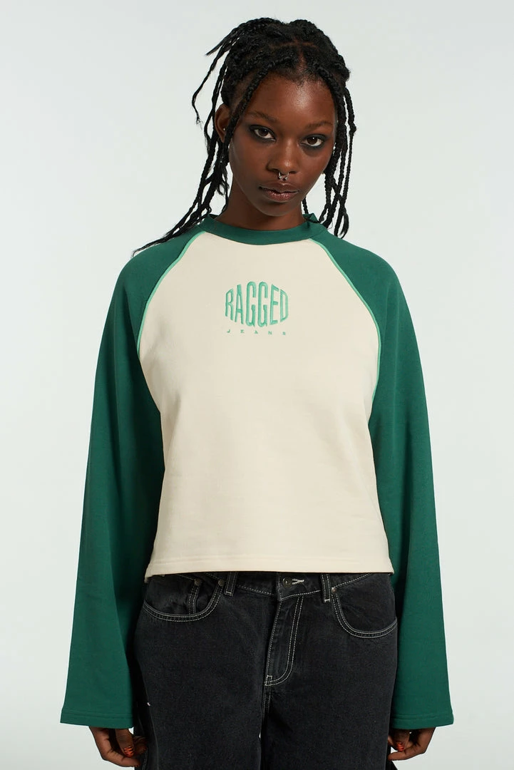 The Ragged Priest Green & off white raglan sweatshirt with green stitching, neckline, sleeves and central “RAGGED Jeans” logo.