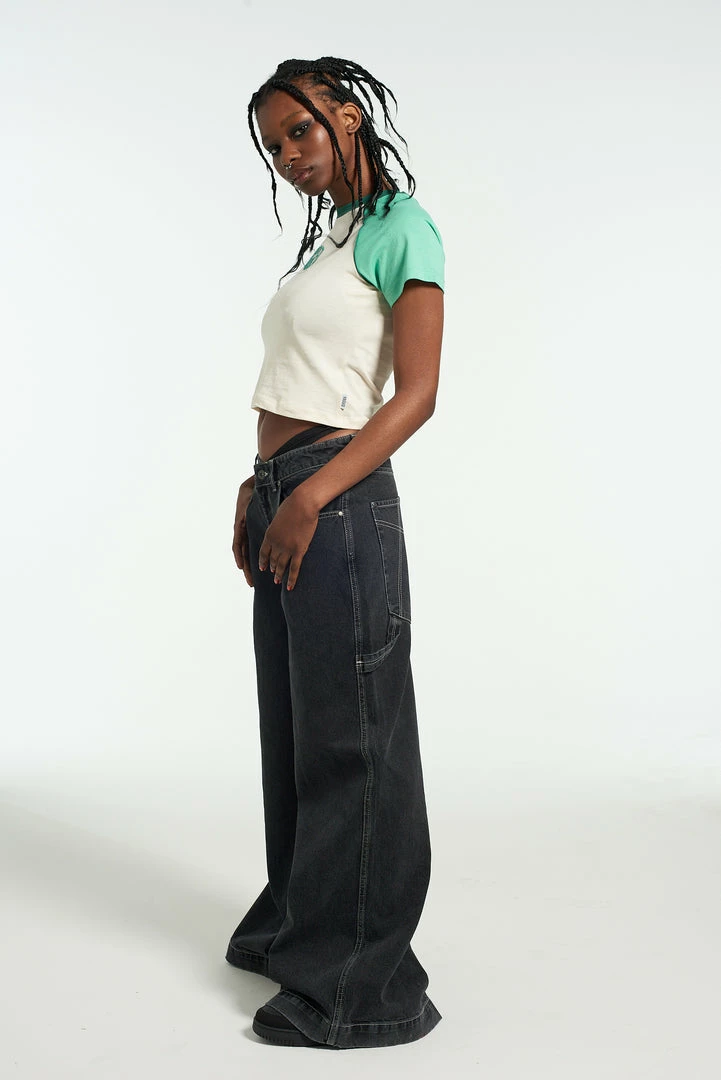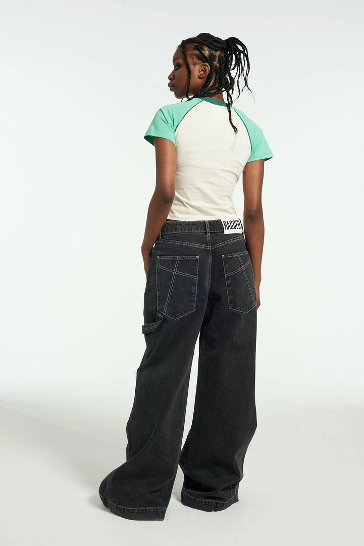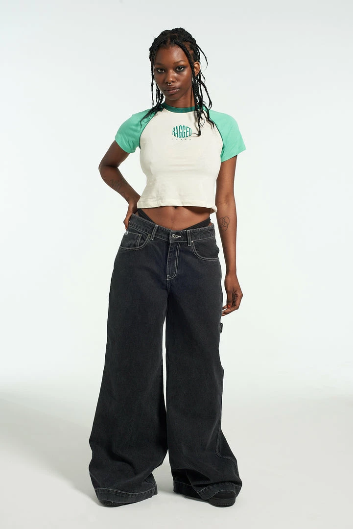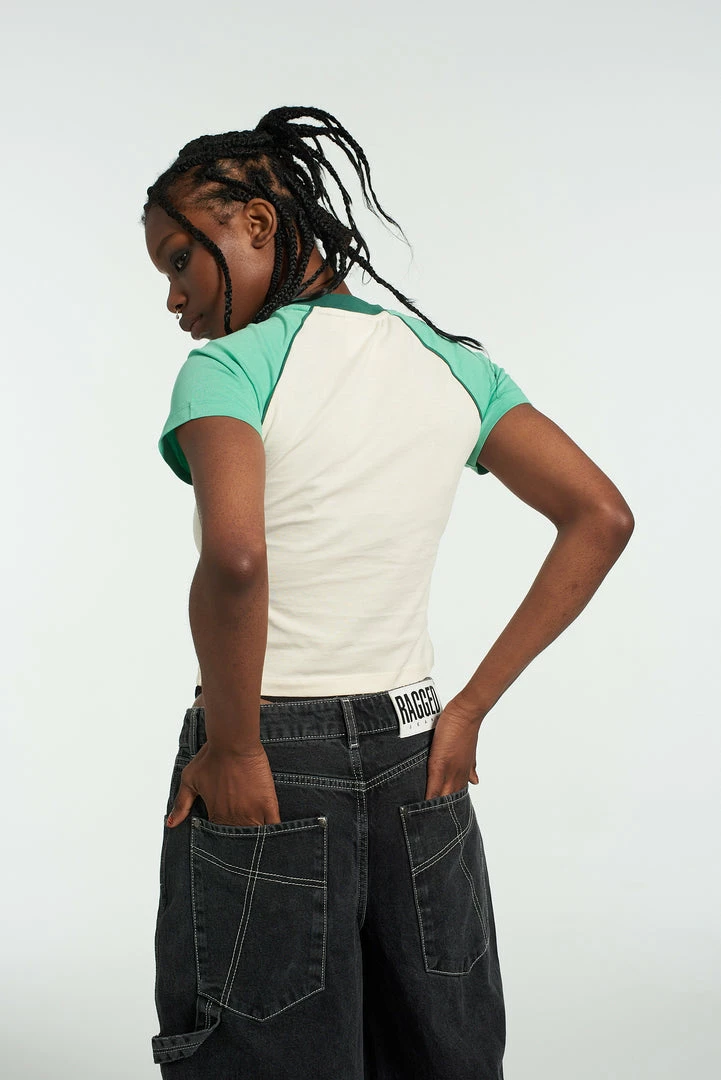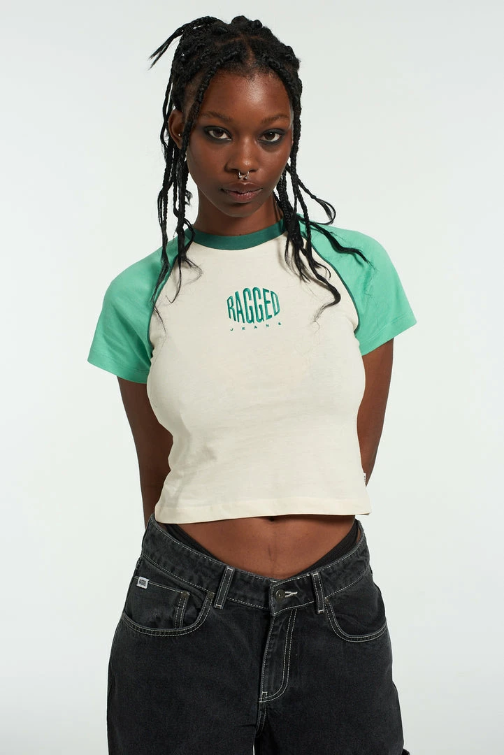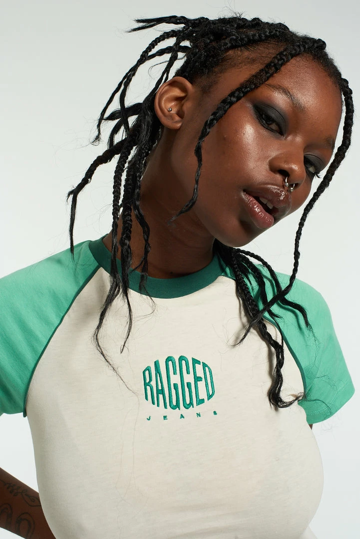 The Ragged Priest Green & white raglan tee with green stitching, neckline and central “RAGGED Jeans” logo.