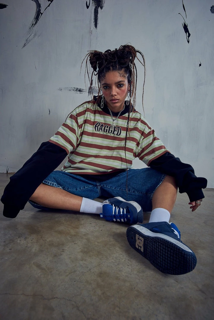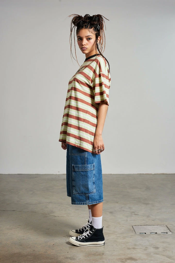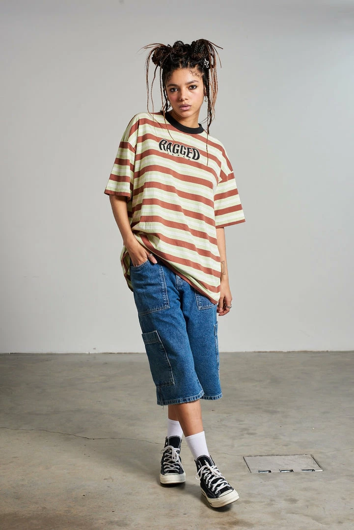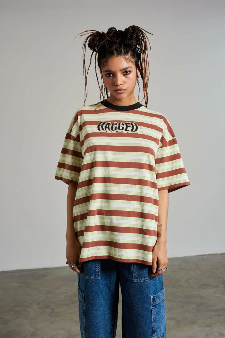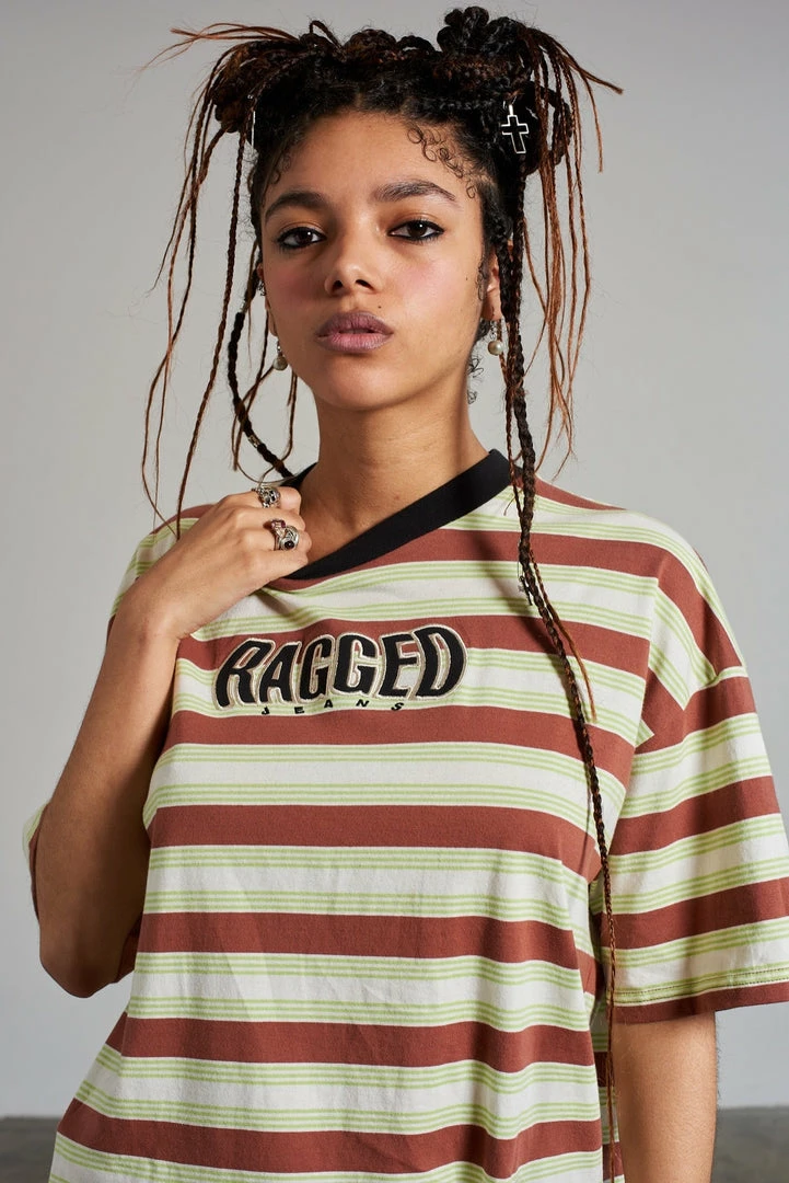 Ragged Jeans brown & green stripe oversized short sleeve tee with ‘Ragged Priest’ appliqué logo.