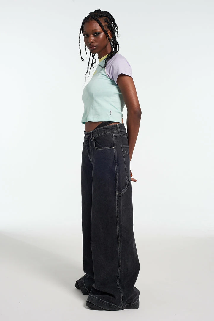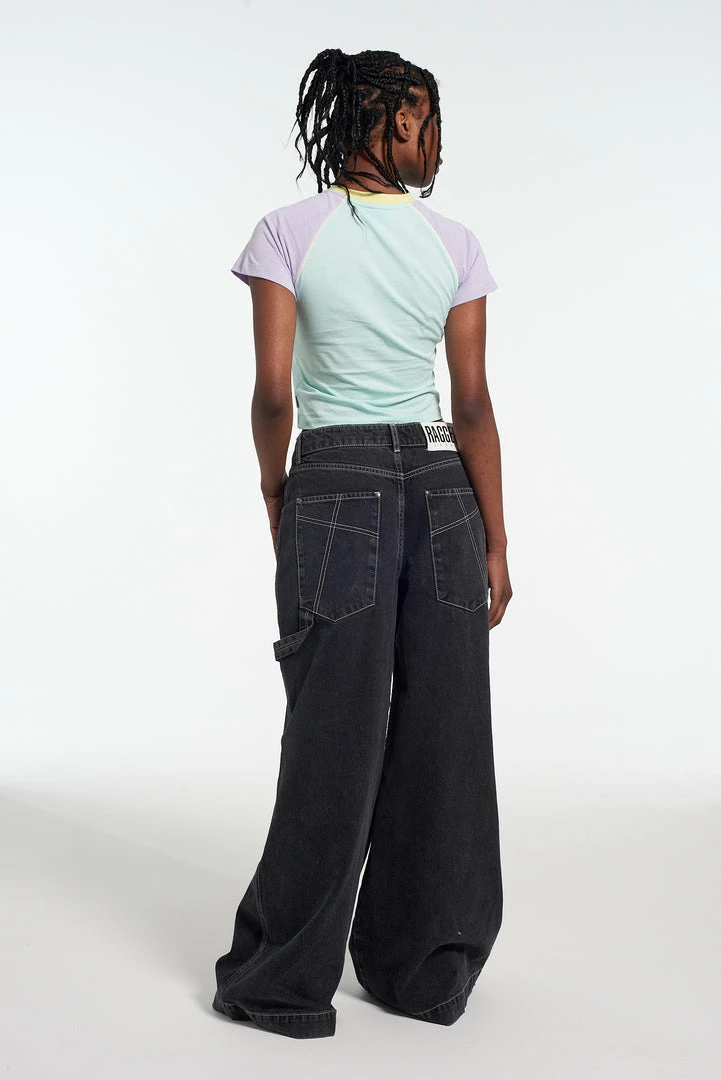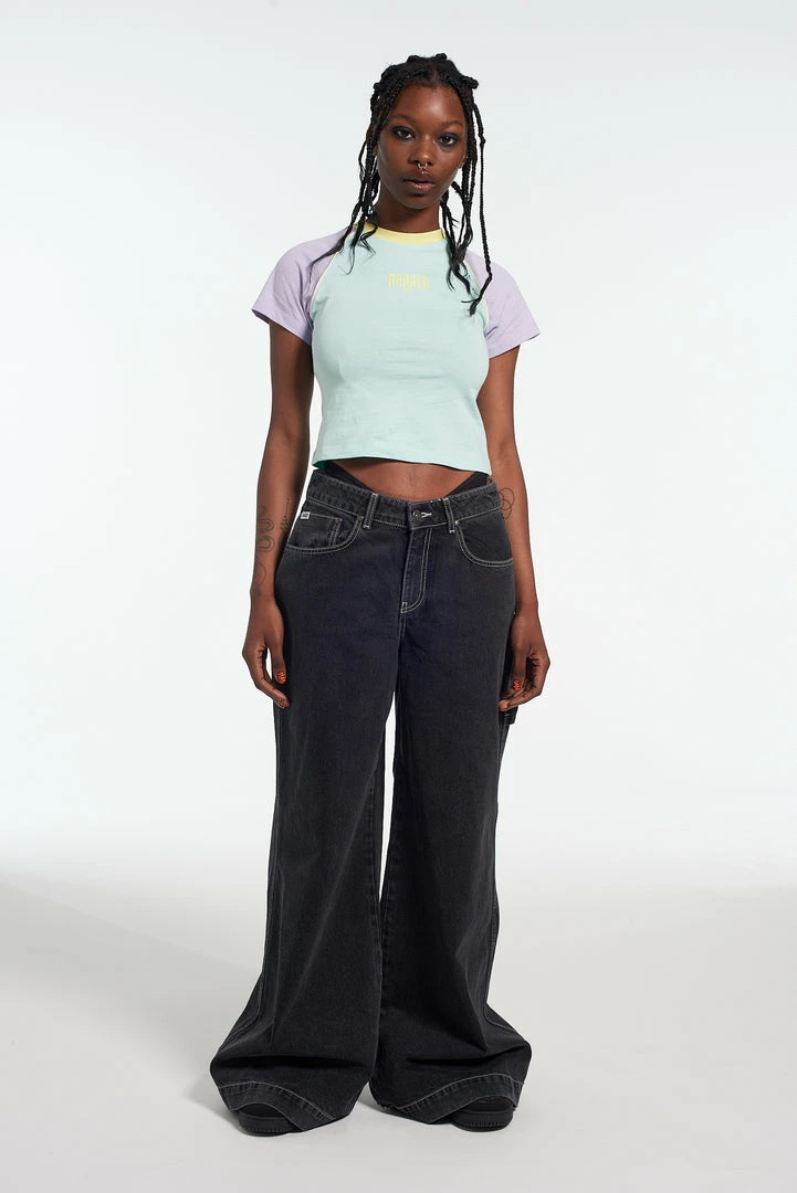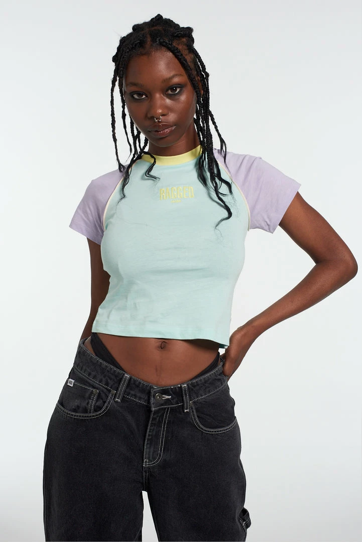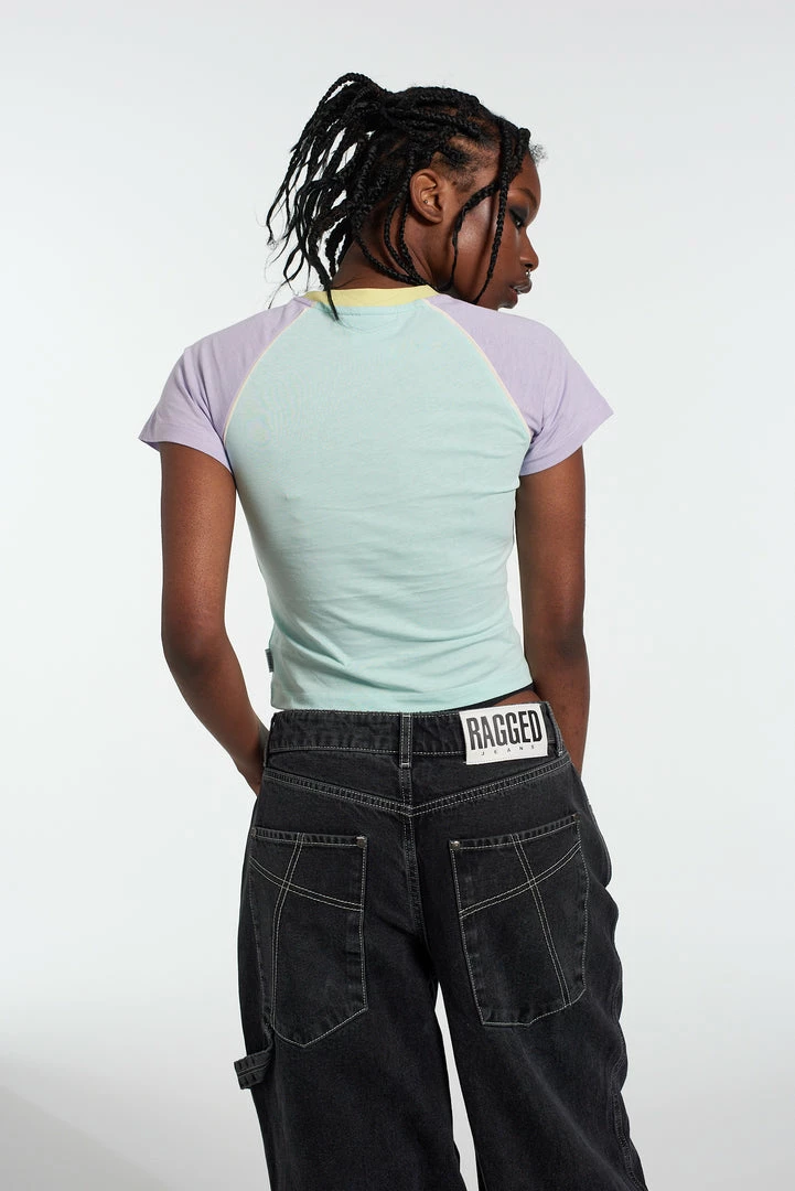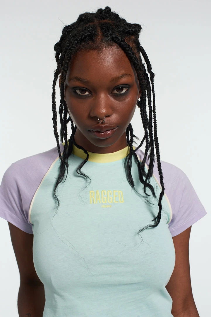 The Ragged Priest Pastel blue & lilac raglan tee with yellow stitching, neckline and central “RAGGED Jeans” logo.