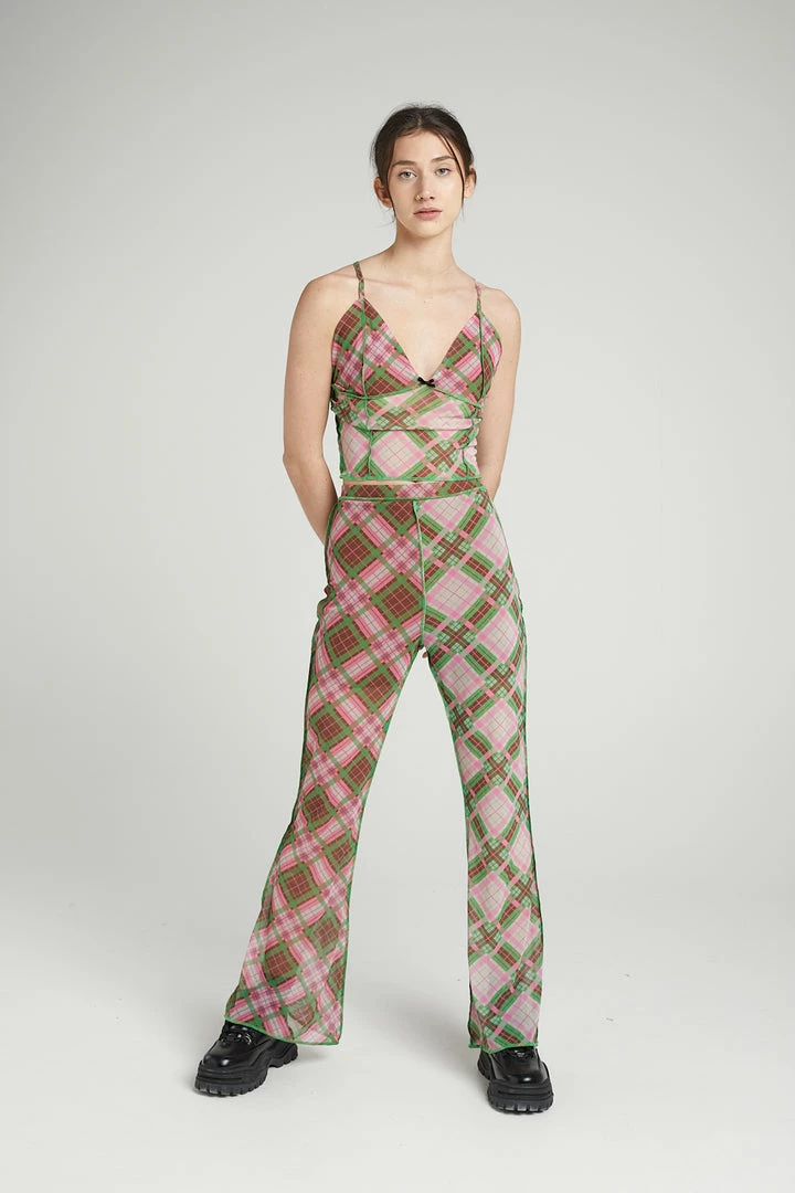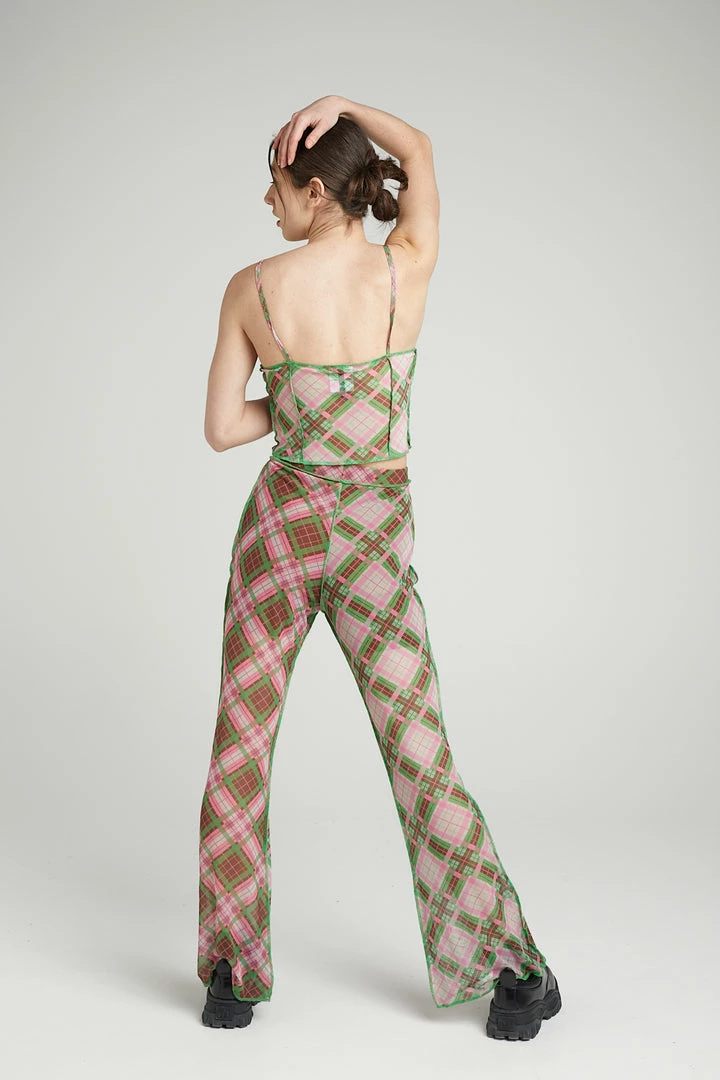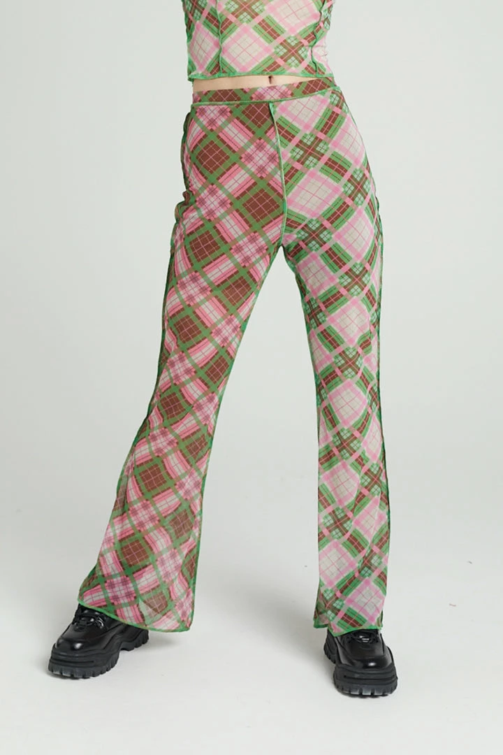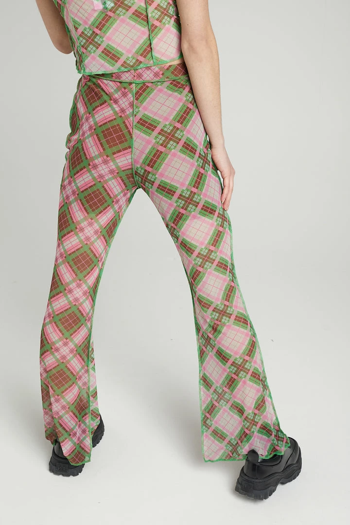 The Ragged Priest high waisted half and half check mesh flared trousers with exposed seams.