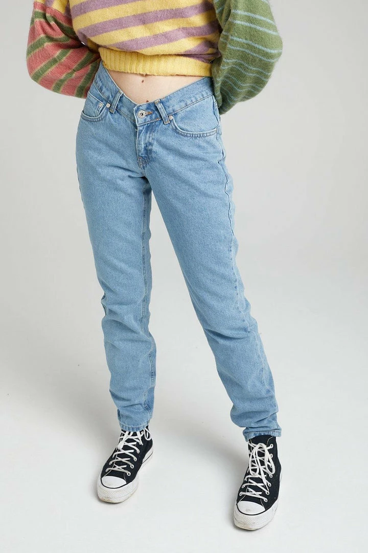 Ragged Jeans blue V front waistband jeans. Featuring light blue denim and “RAGGED Jeans” belt loop tab.