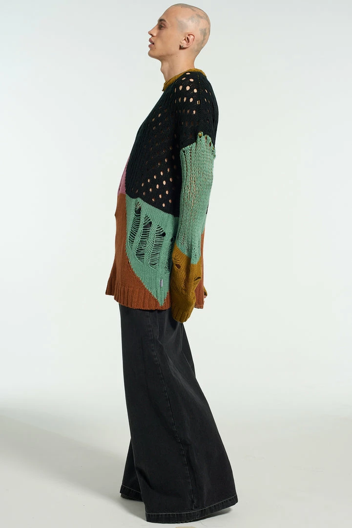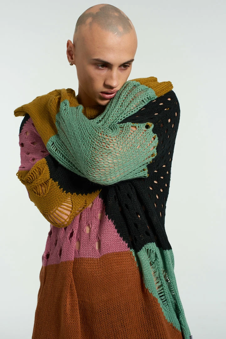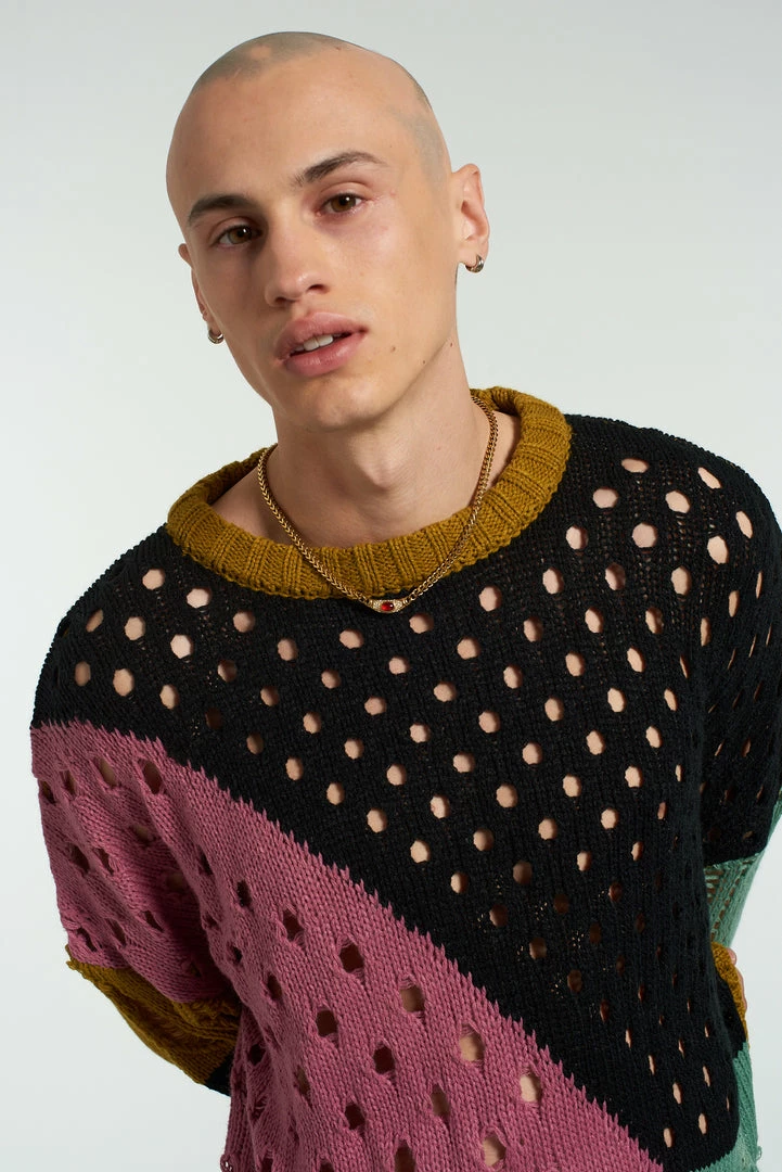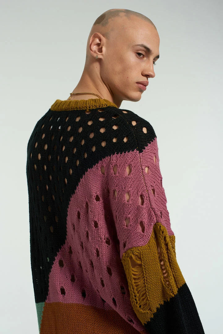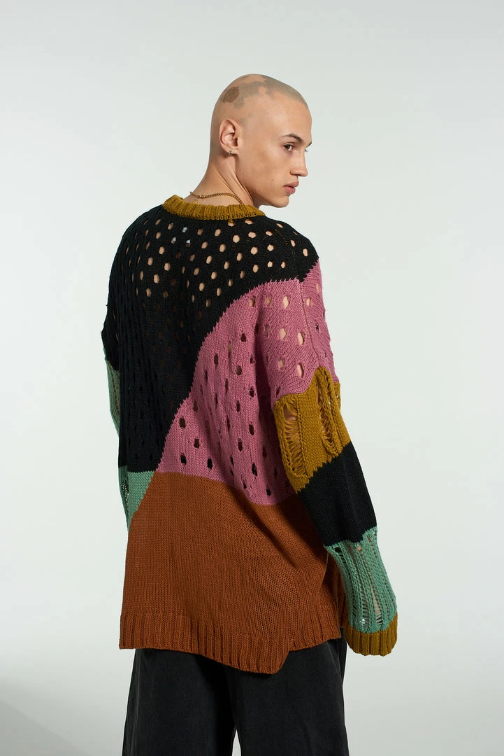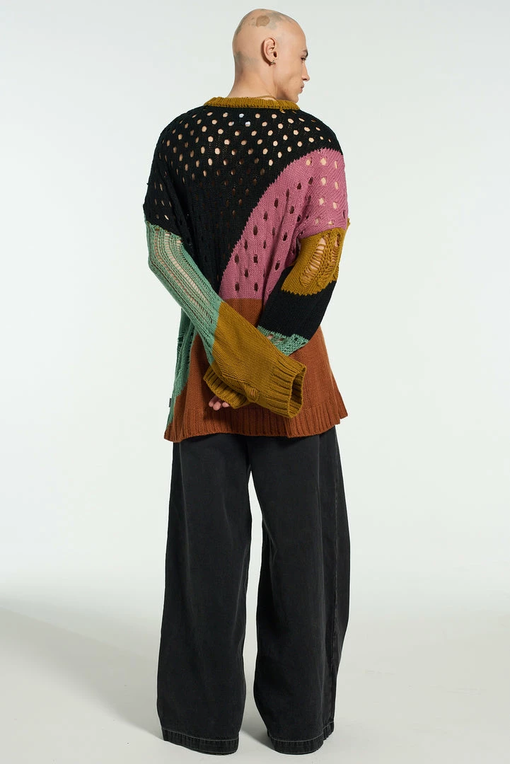 The Ragged Priest men’s spliced hole jumper in black, pink, blue, orange, black and mustard yellow.
