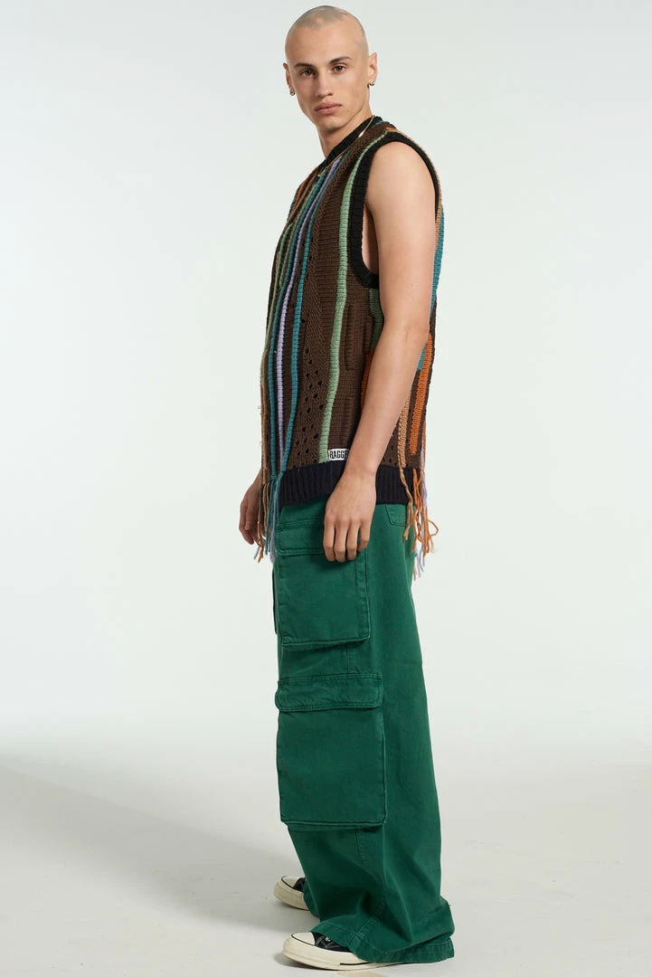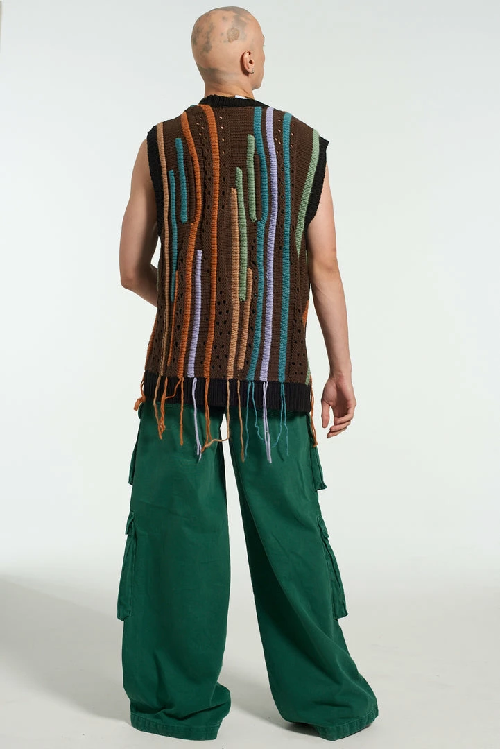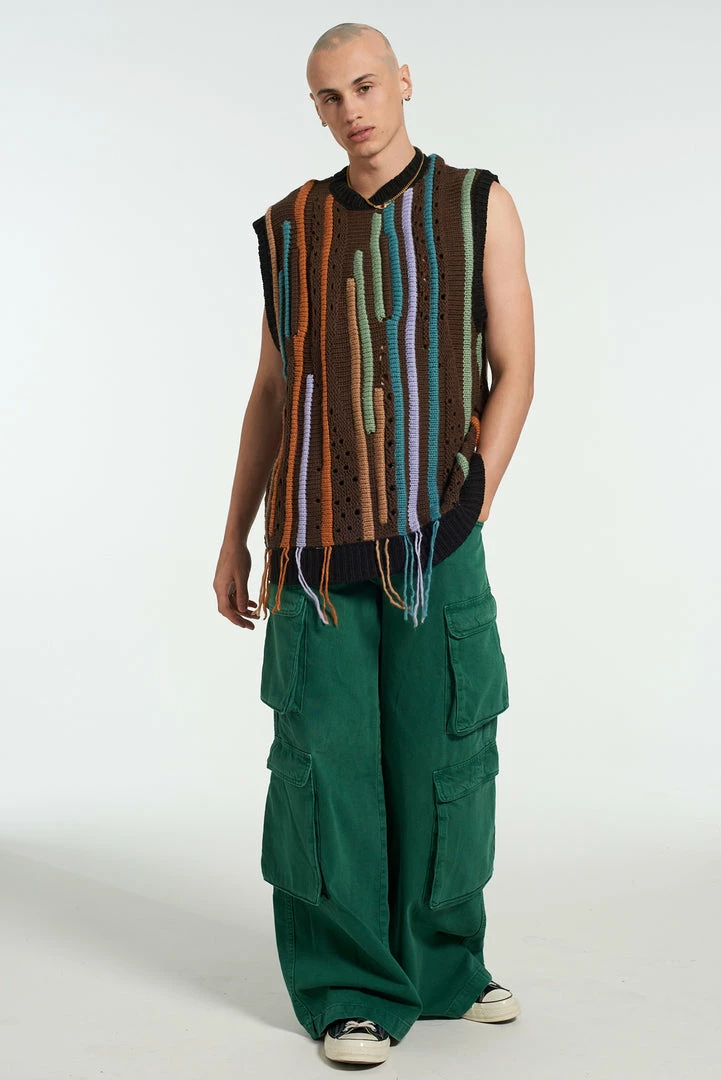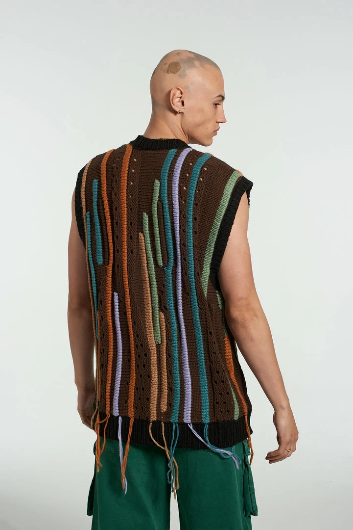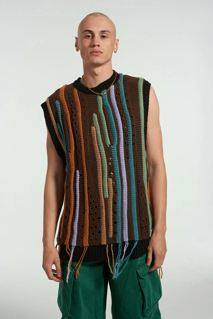 Ragged Jeans mens brown knit vest with multicolour loose thread stipe detail.