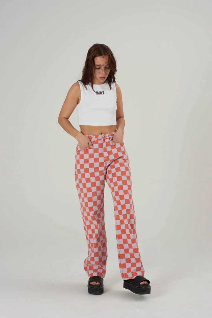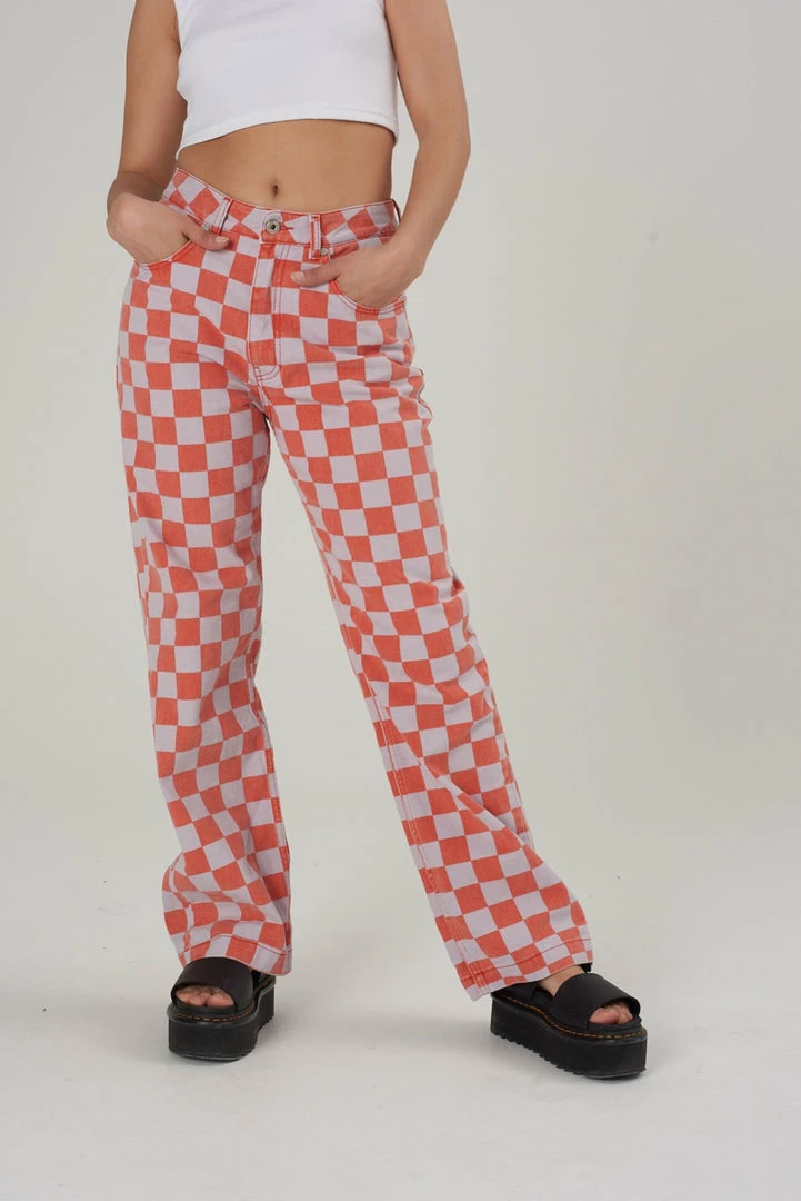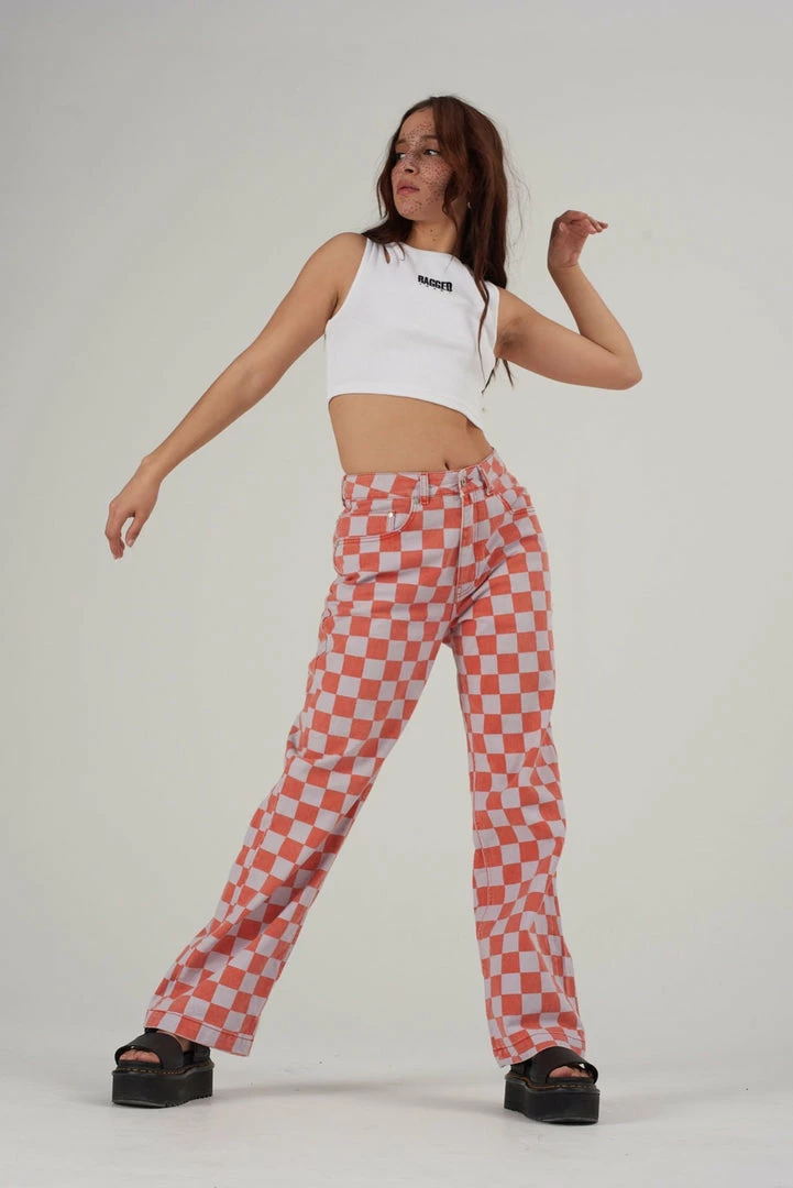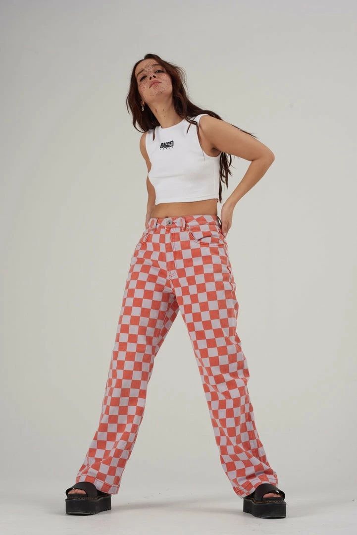 Ragged Jeans red & purple checkerboard denim dad jeans.
