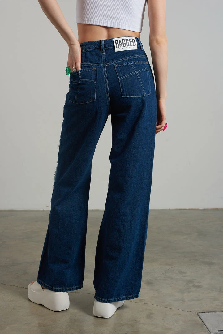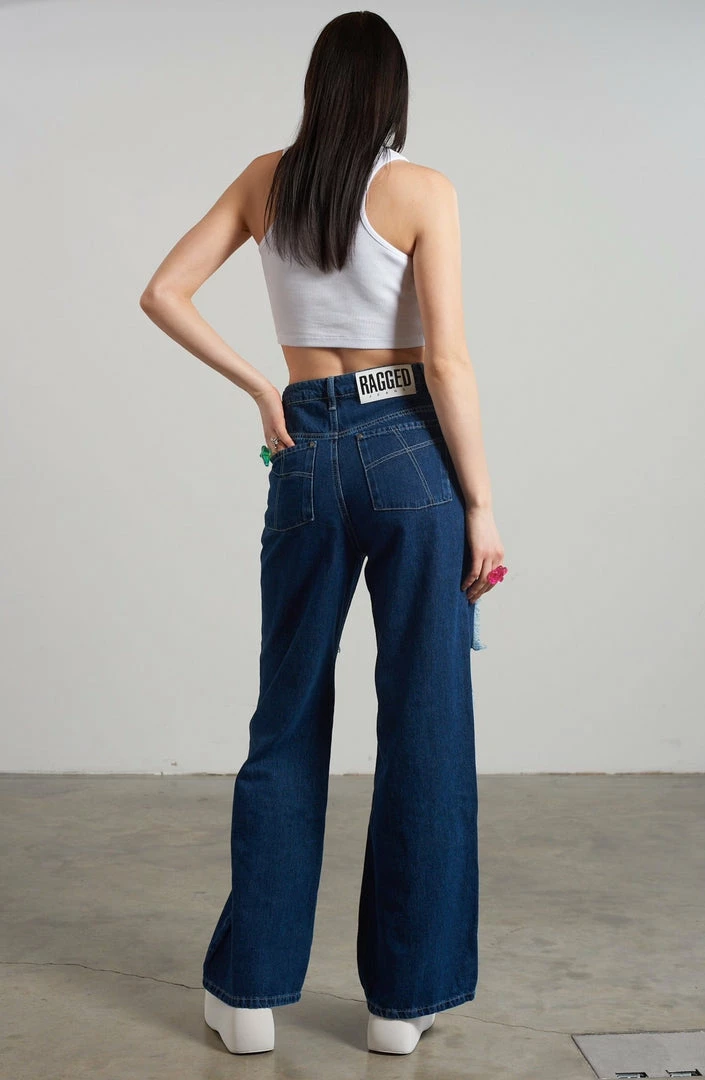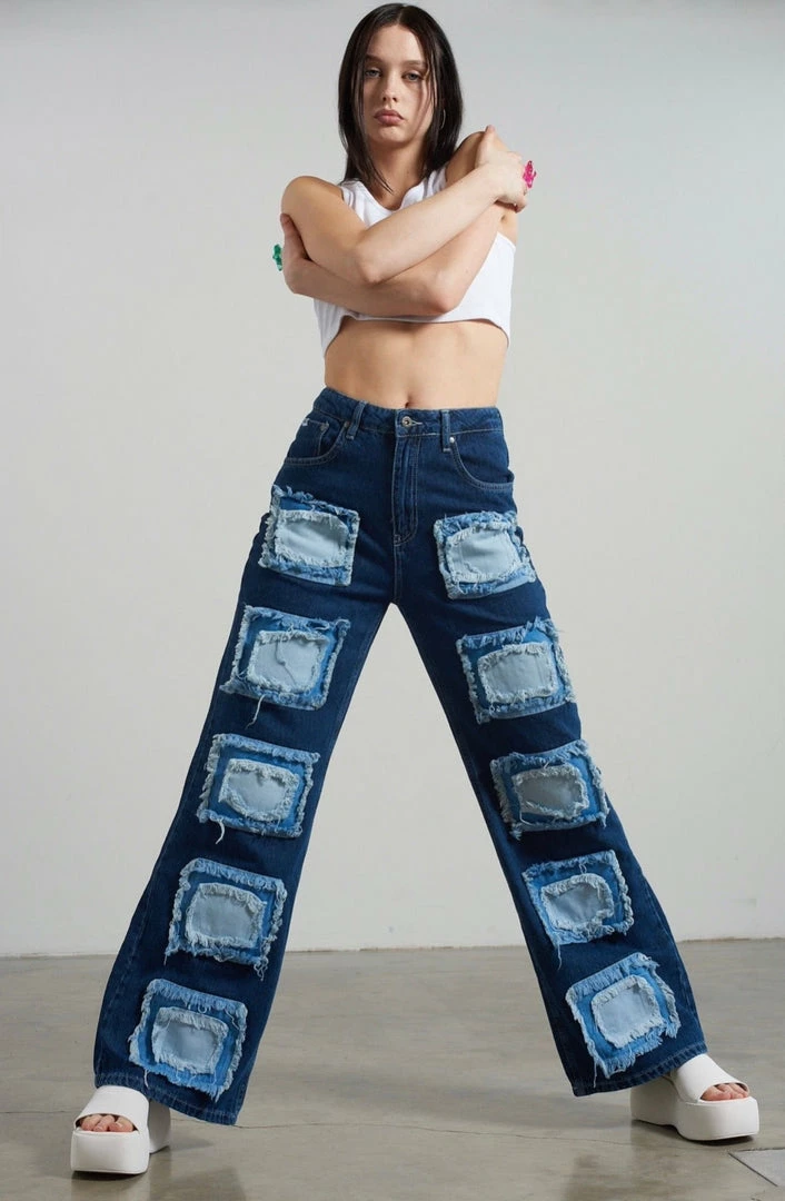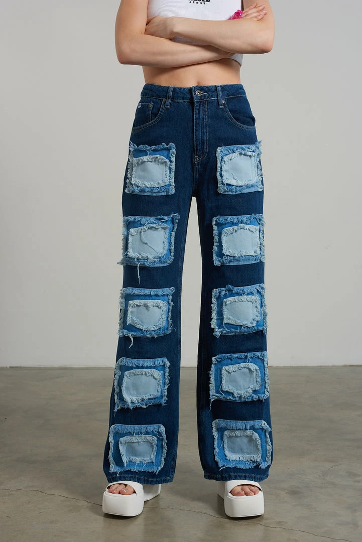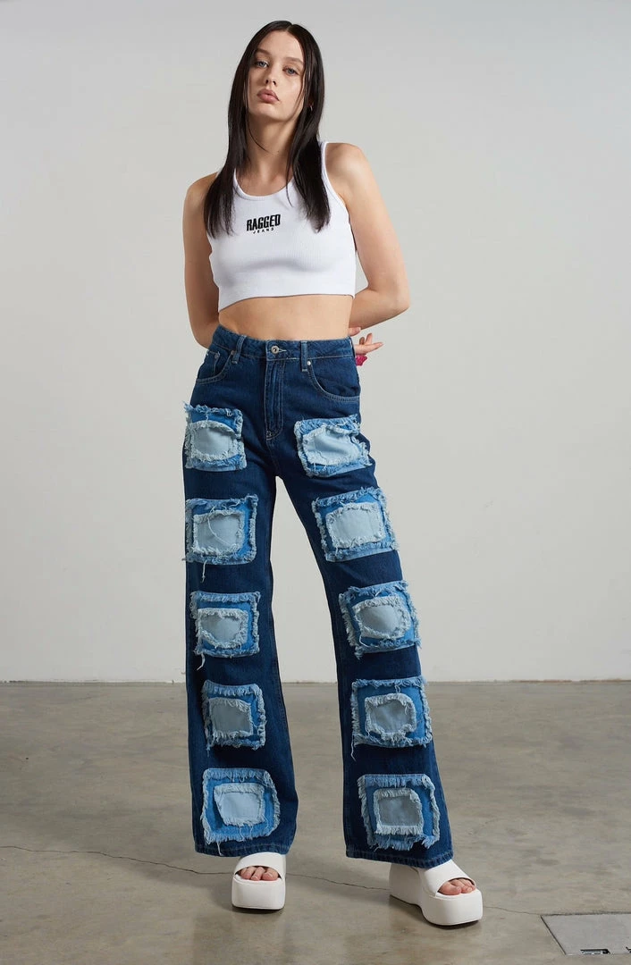 Ragged Jeans blue baggy denim jeans with appliqué squares detail.