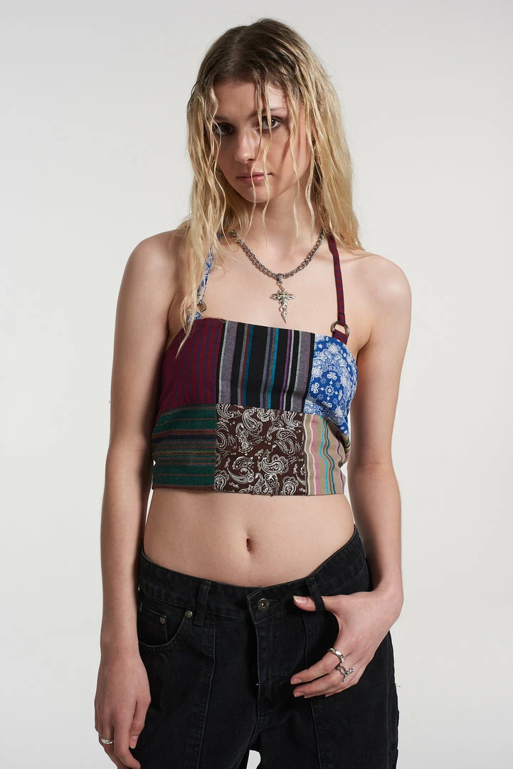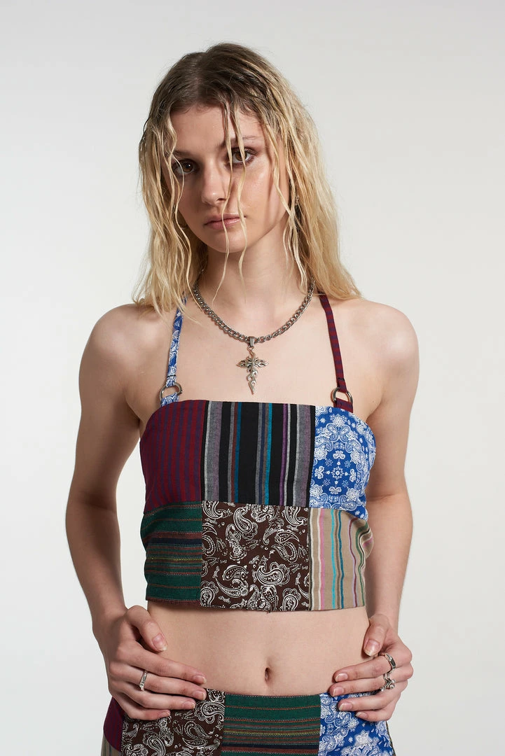 The Ragged Priest mix patchwork printed crop top with D ring lace up back detail and adjustable halter neck.