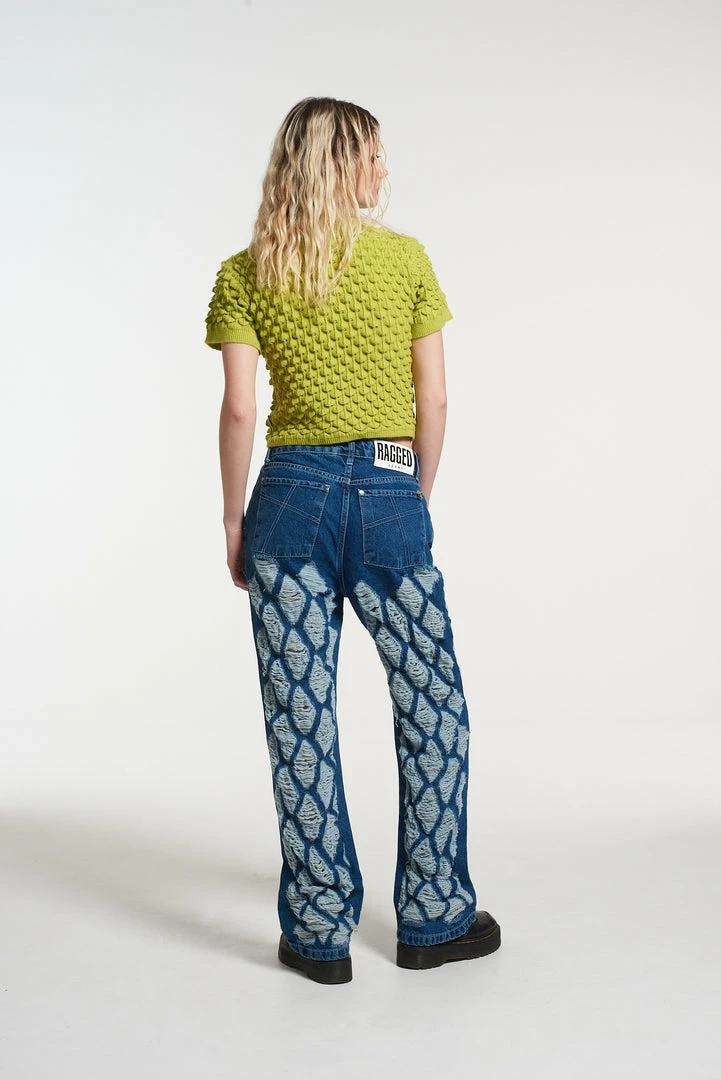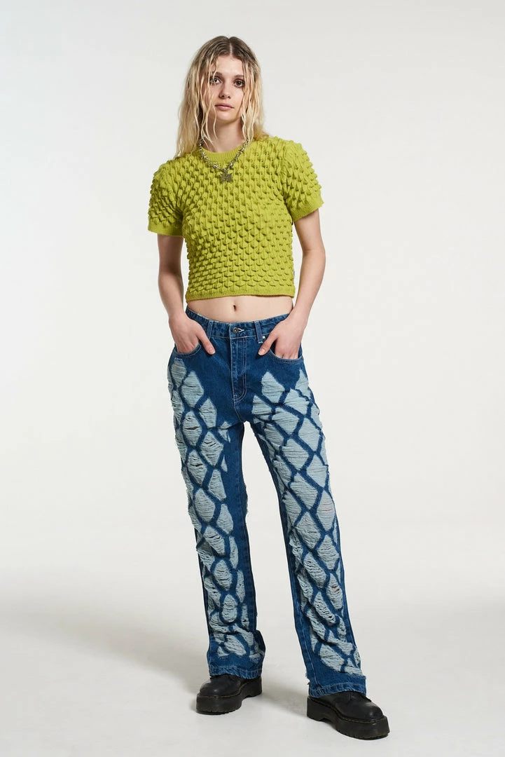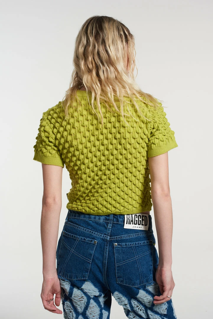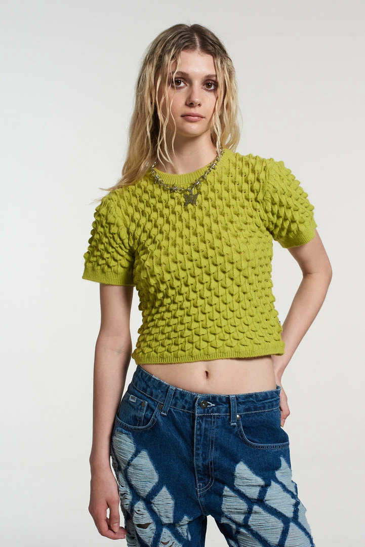 The Ragged Priest lime green popcorn style knitted short sleeved crop top.