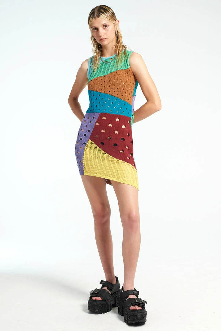 The Ragged Priest Spliced shredded patchwork mini dress in multicoloured knit with an asymmetric hem.