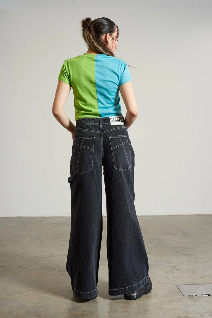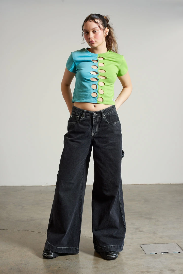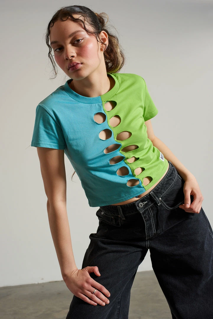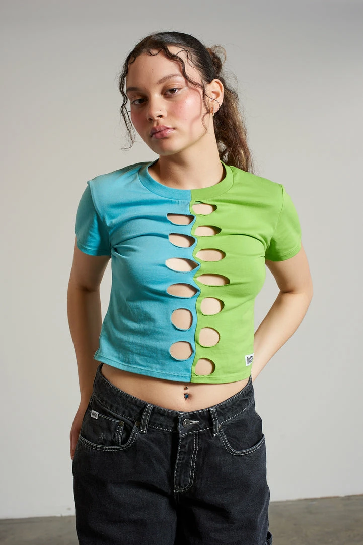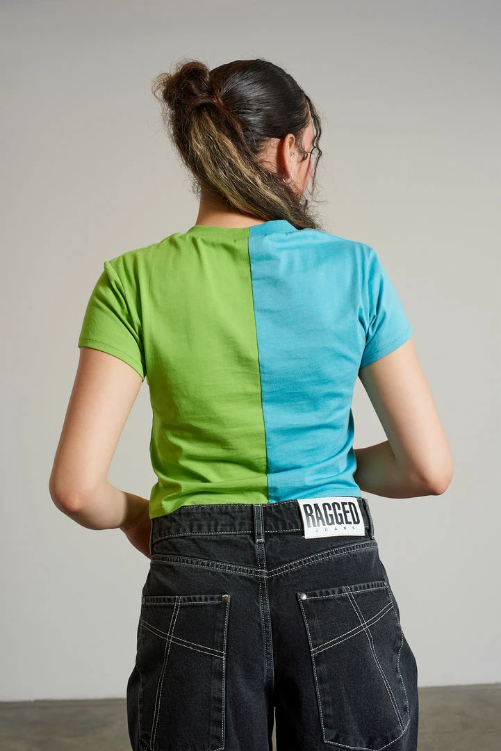 Ragged Jeans green and blue half and half short sleeve tee with cut out front detail.