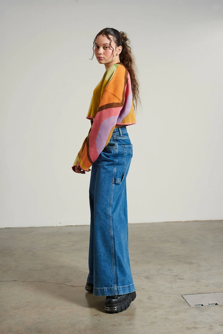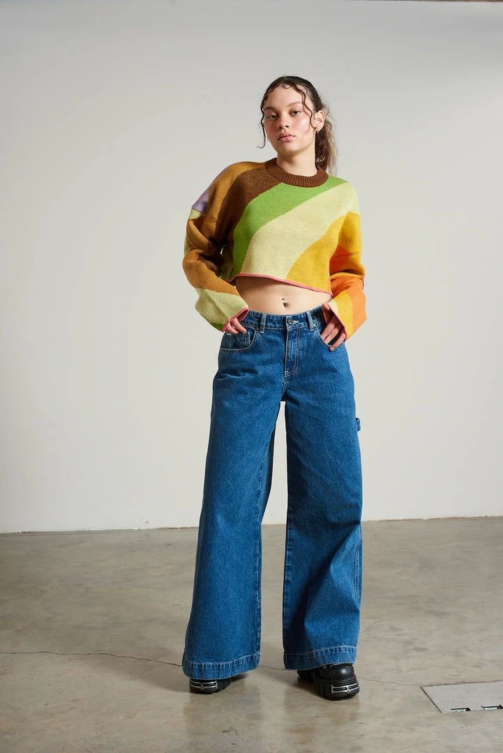 Ragged Jeans cropped multi wave / stripe rainbow pattern knitted jumper with “RAGGED” logo tab.