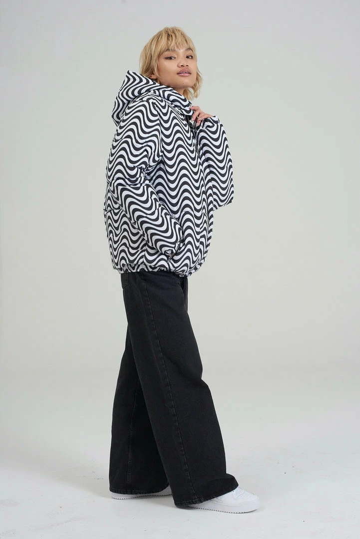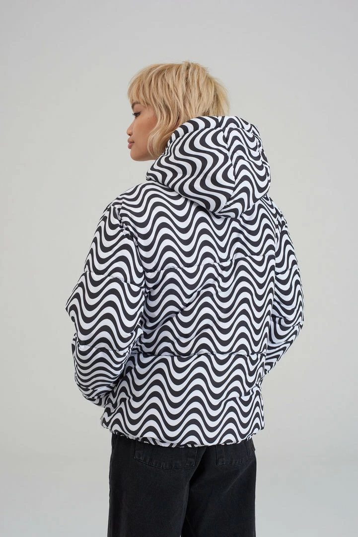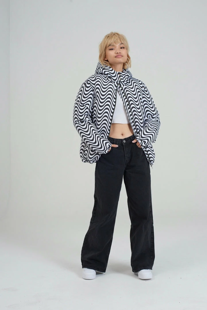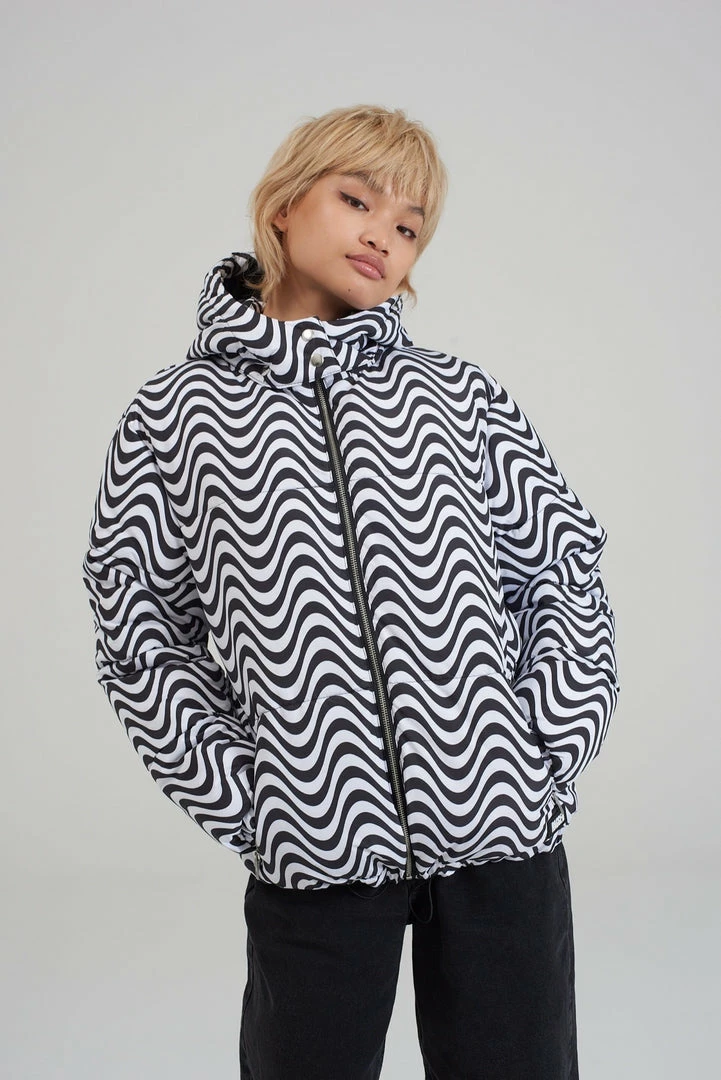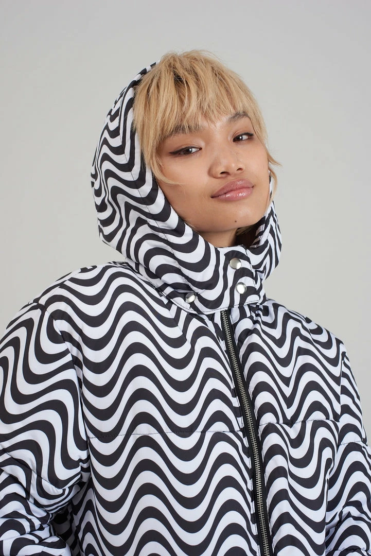 Ragged Jeans black & white wave pattern printed puffer coat with hood.