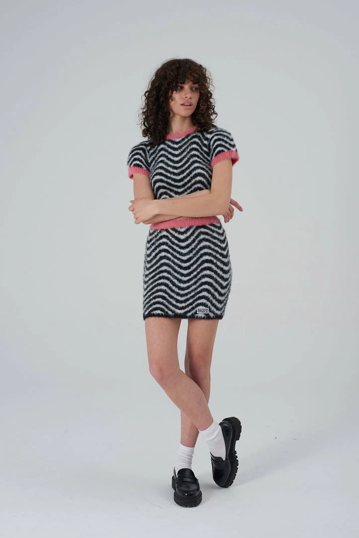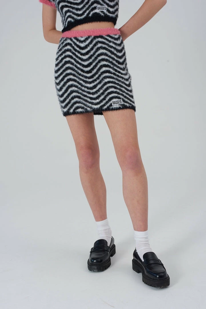 Ragged Jeans black & white wave pattern eyelash knit mini skirt.