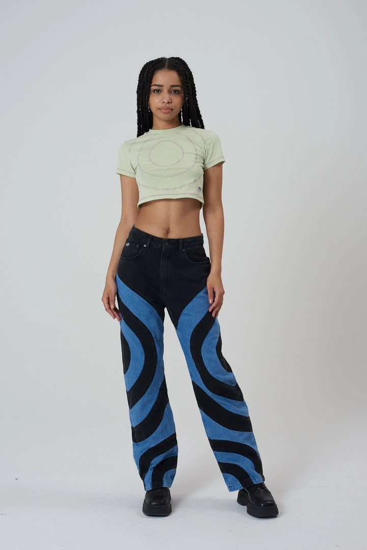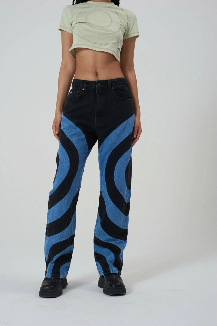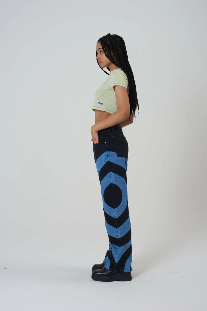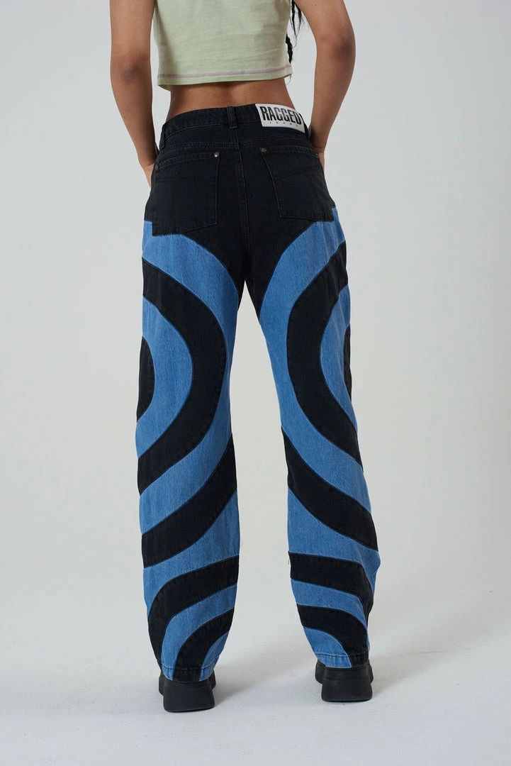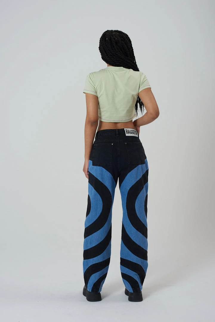 Ragged Jeans charcoal denim dad jeans with blue circle panels.