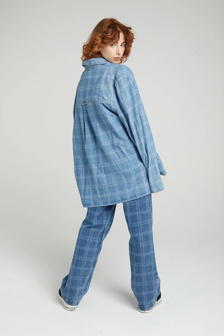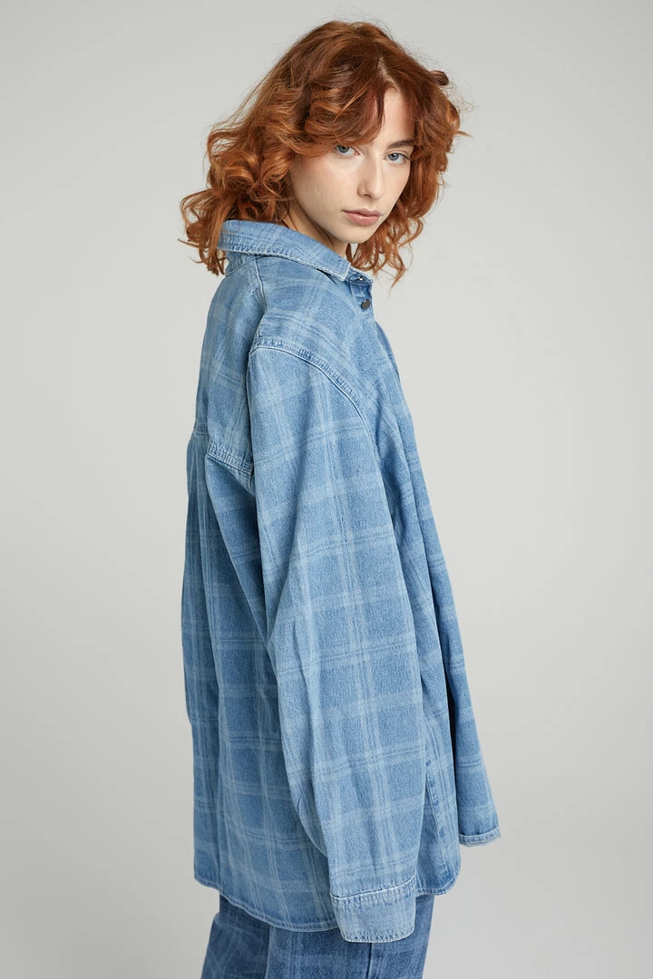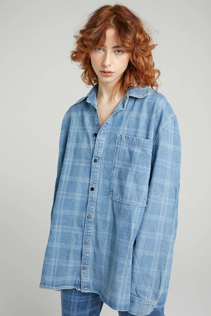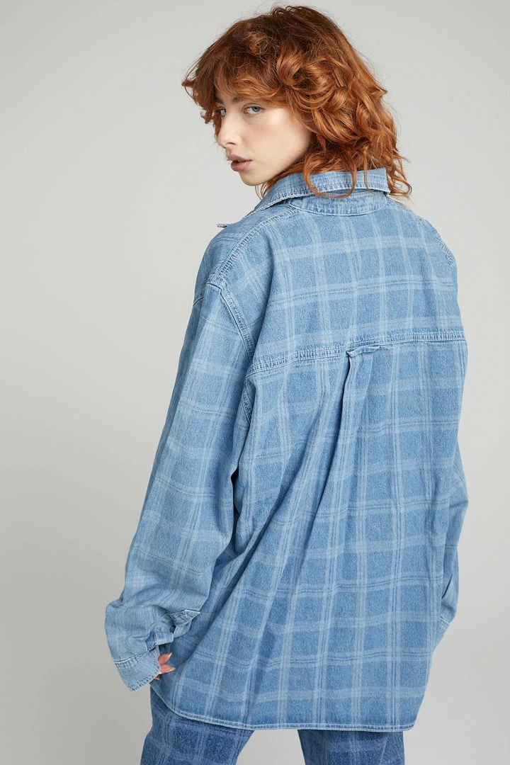 Ragged Jeans oversized blue laser check chambray shirt with “RAGGED Jeans” small fabric pocket tab and front pocket.