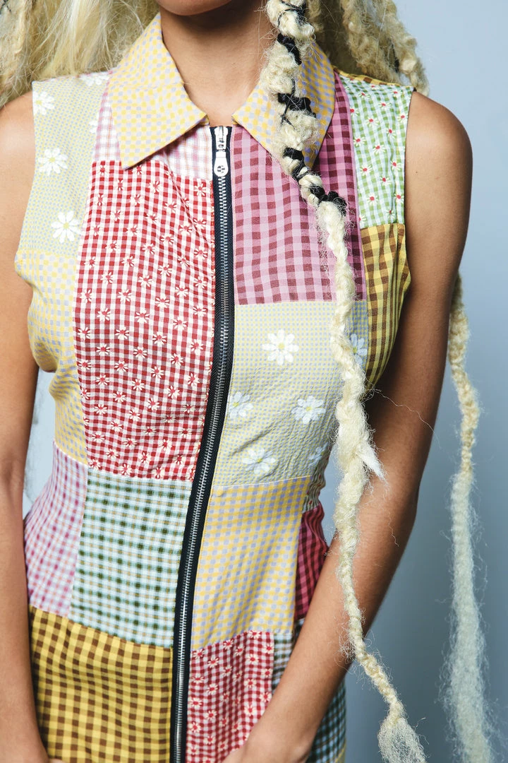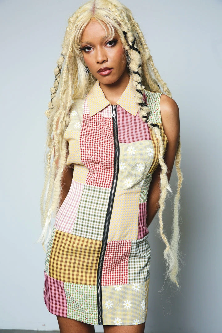 The Ragged Priest multi coloured mixed patchwork zip front fitted shirt dress.