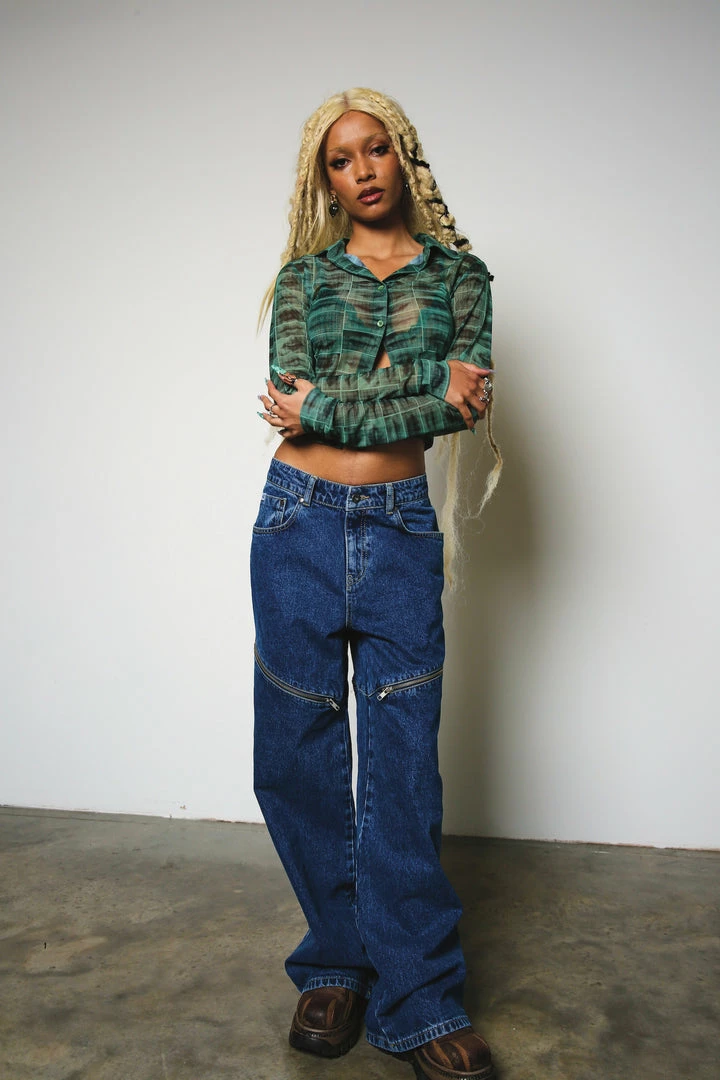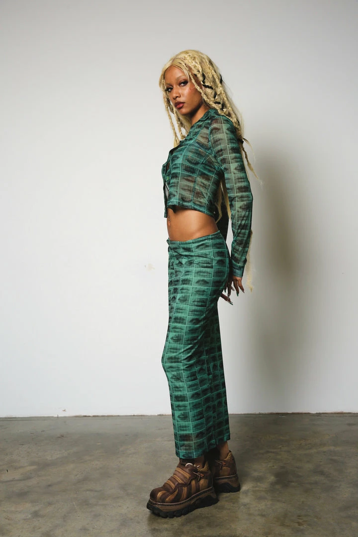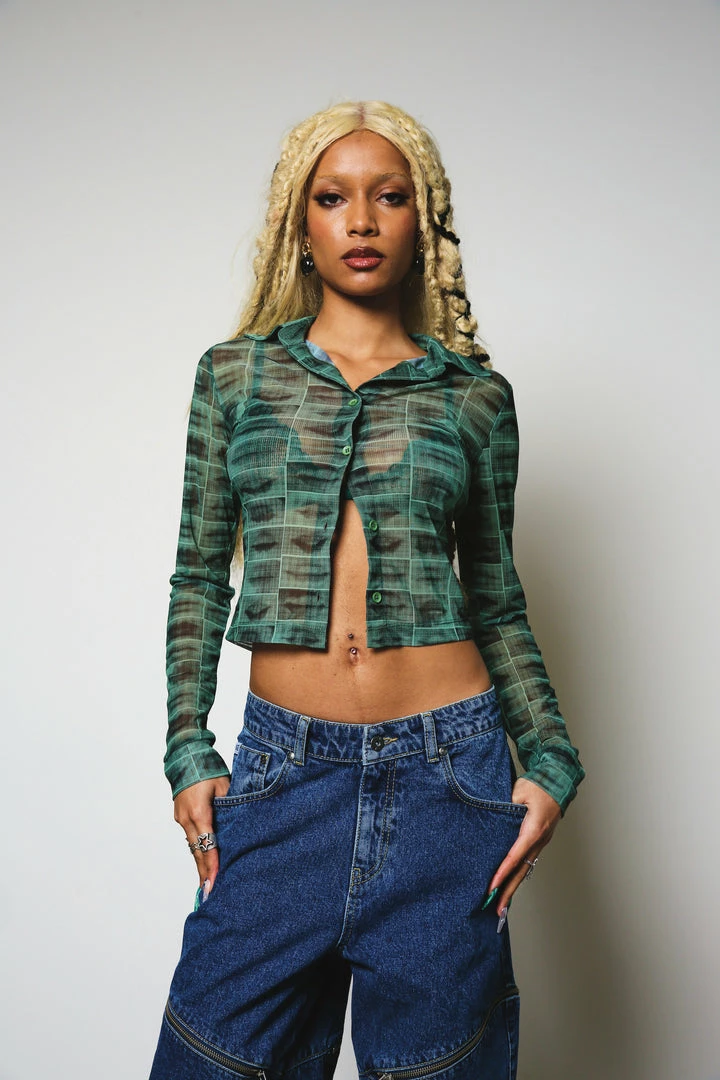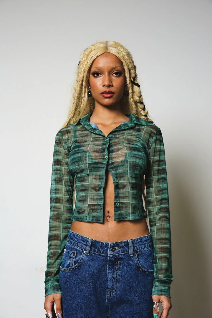 The Ragged Priest green mesh long sleeve shirt with all over lips graphic print.