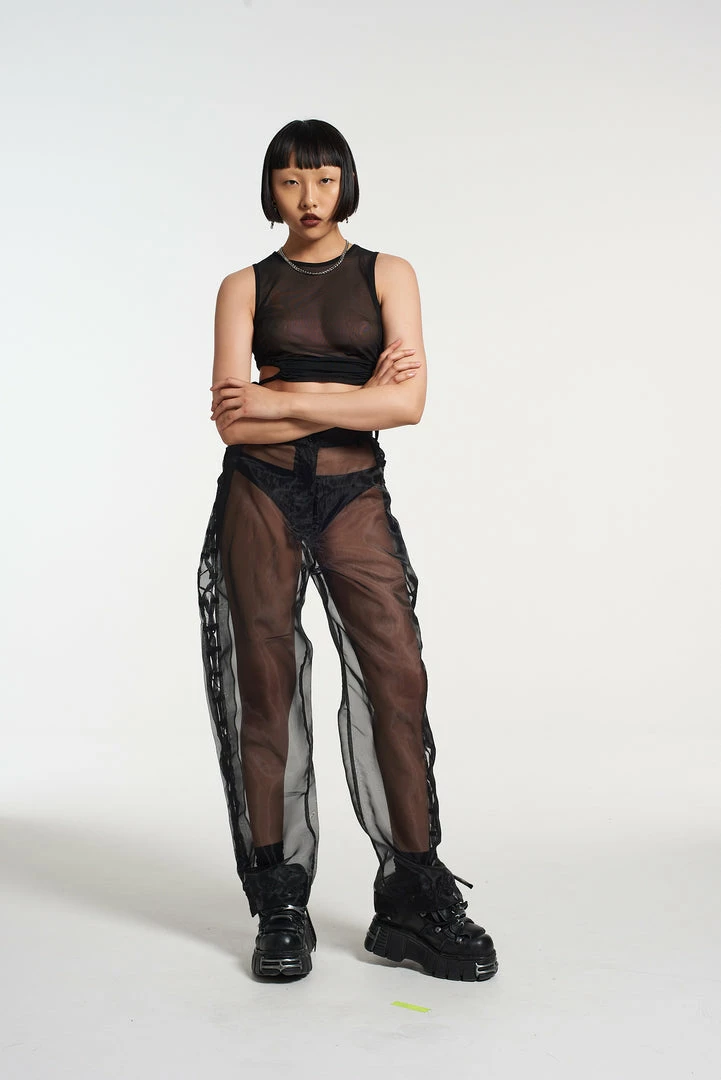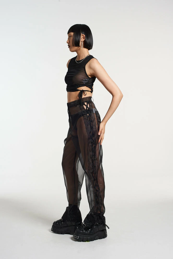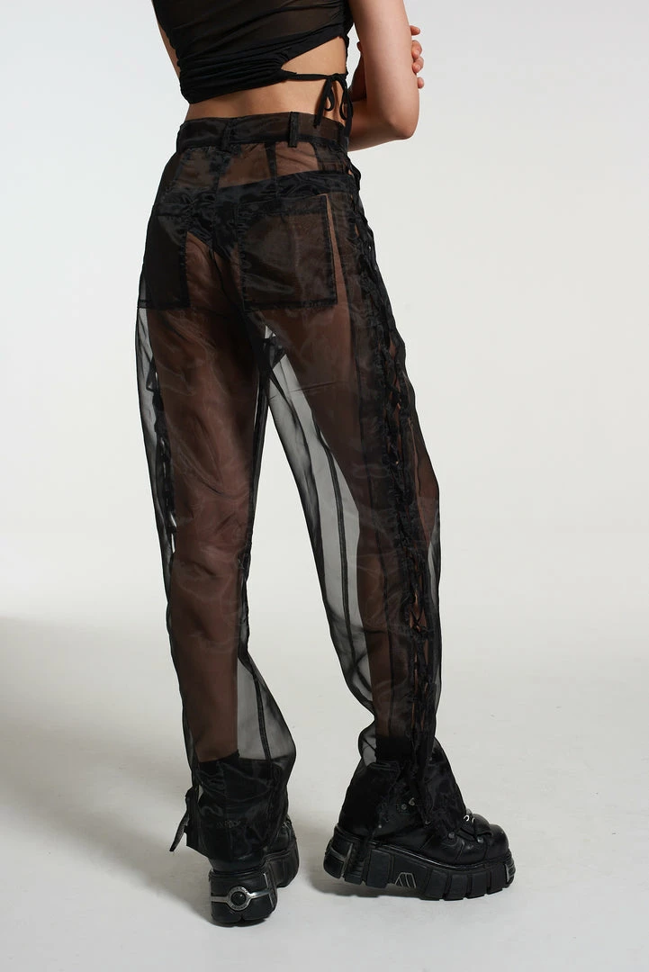 The Ragged Priest black organza trousers with side seam tie up detail on each leg.
