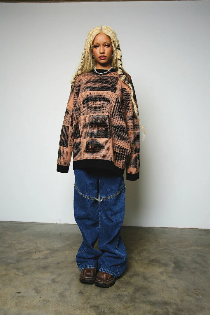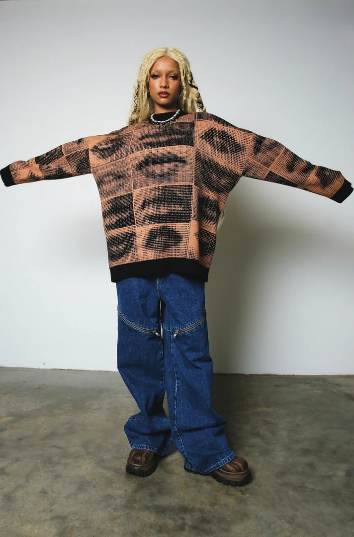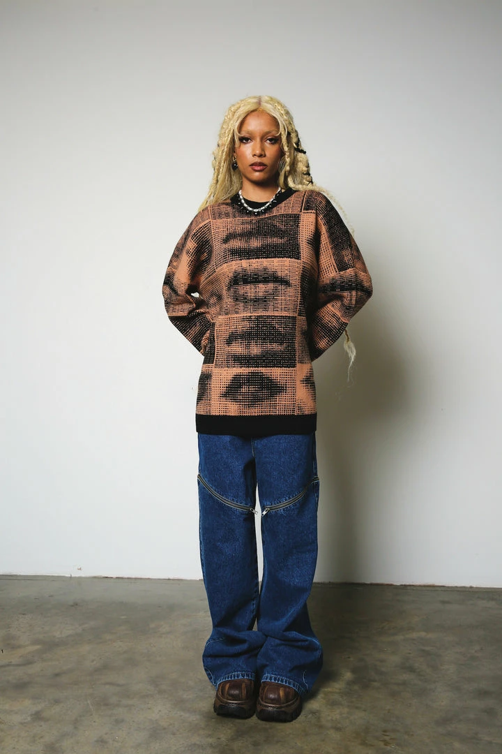 The Ragged Priest brown knit jumper with all over graphic lip print.