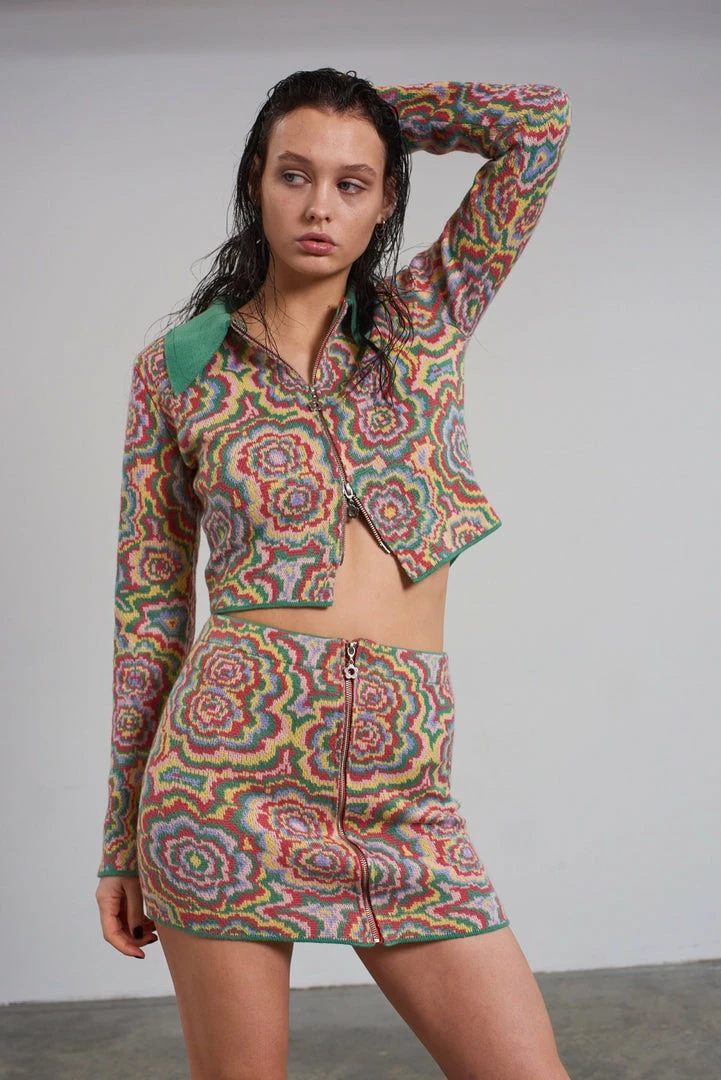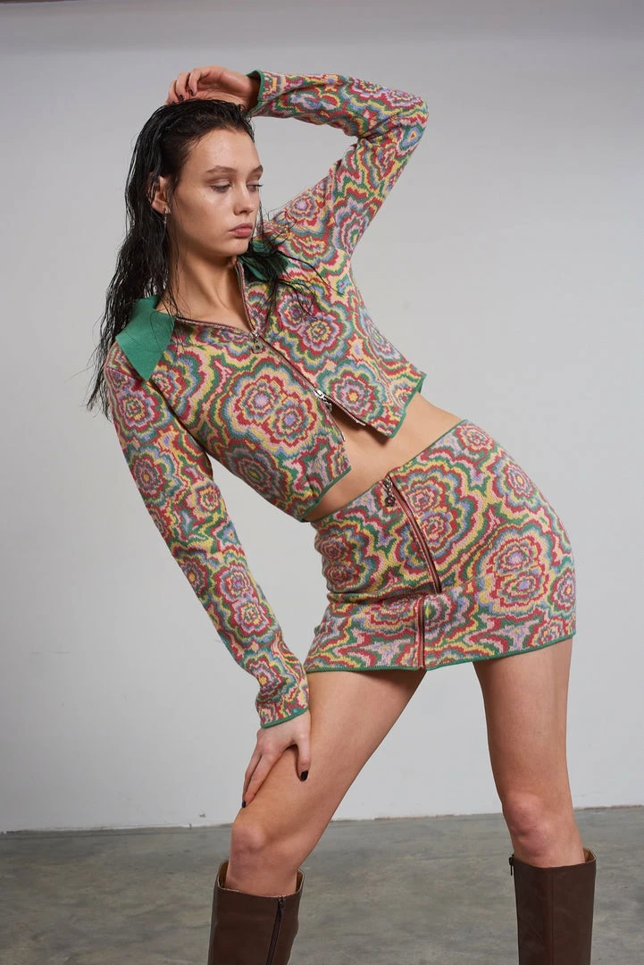 The Ragged Priest multi colour trippy floral jacquard knitted skirt with front zip detail.
