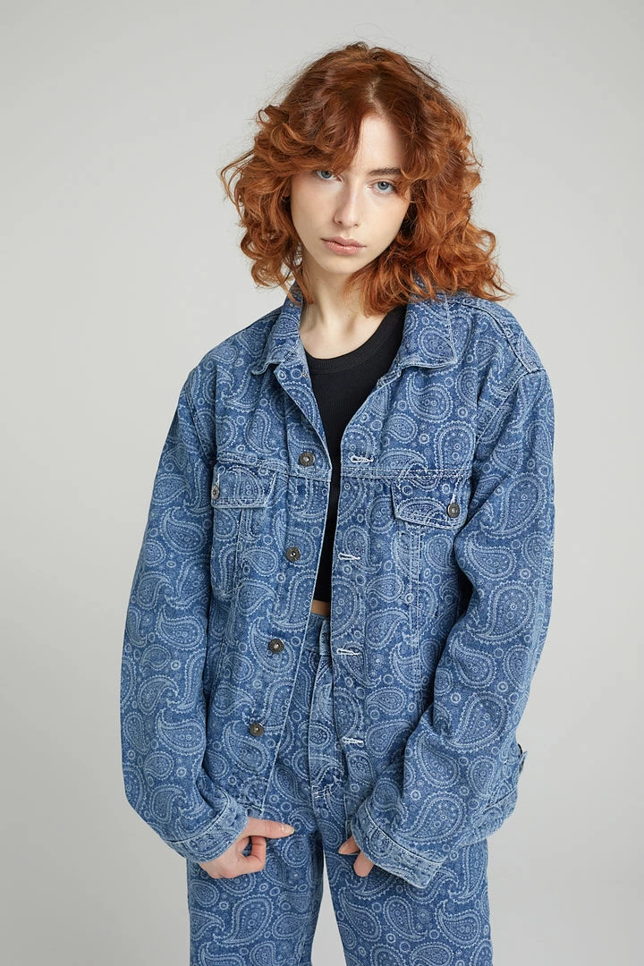 Ragged Jeans blue denim jacket with paisley printed design in white and “RAGGED Jeans” back tab.