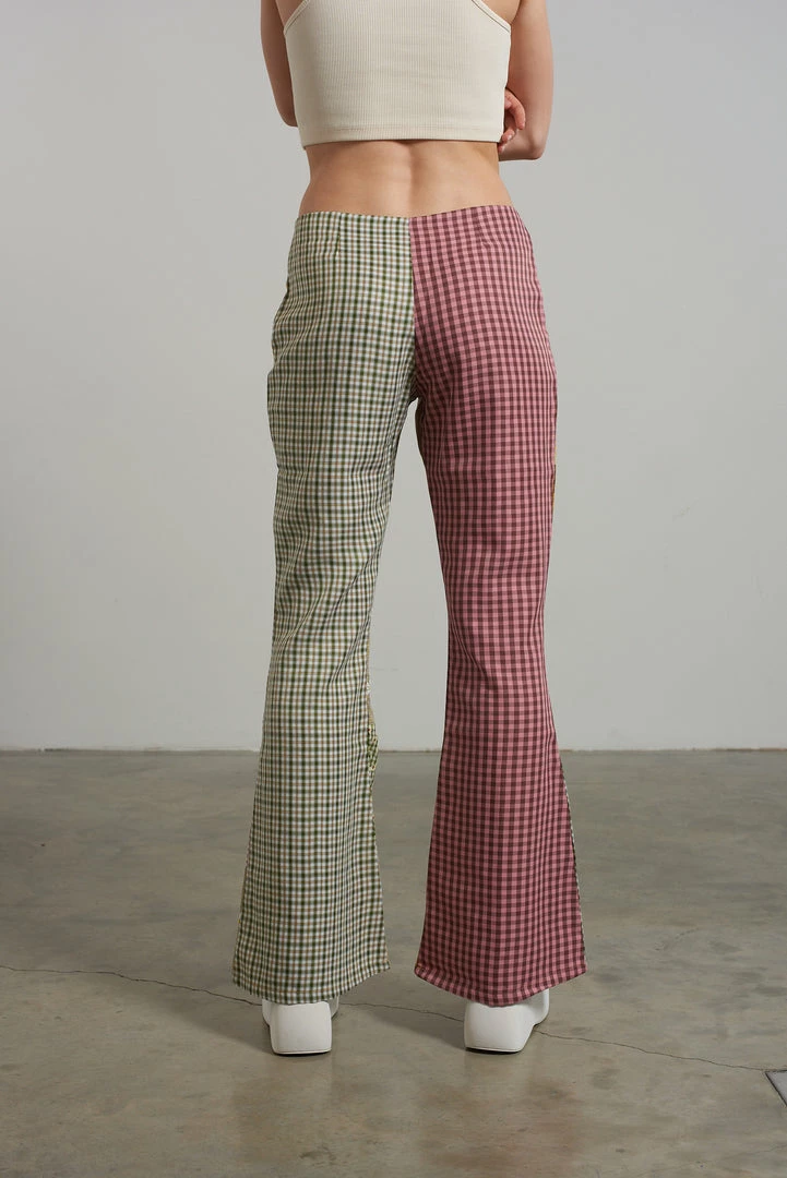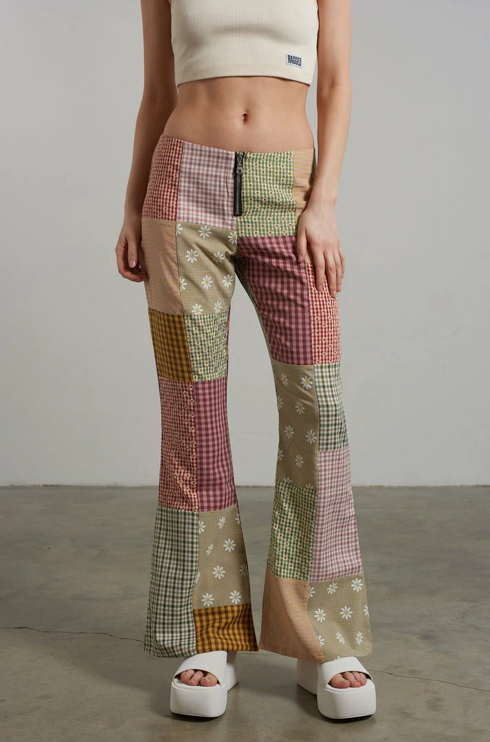 The Ragged Priest multi coloured mixed patchwork flared pant with zip front.