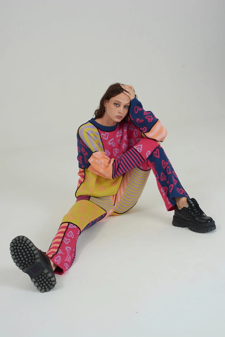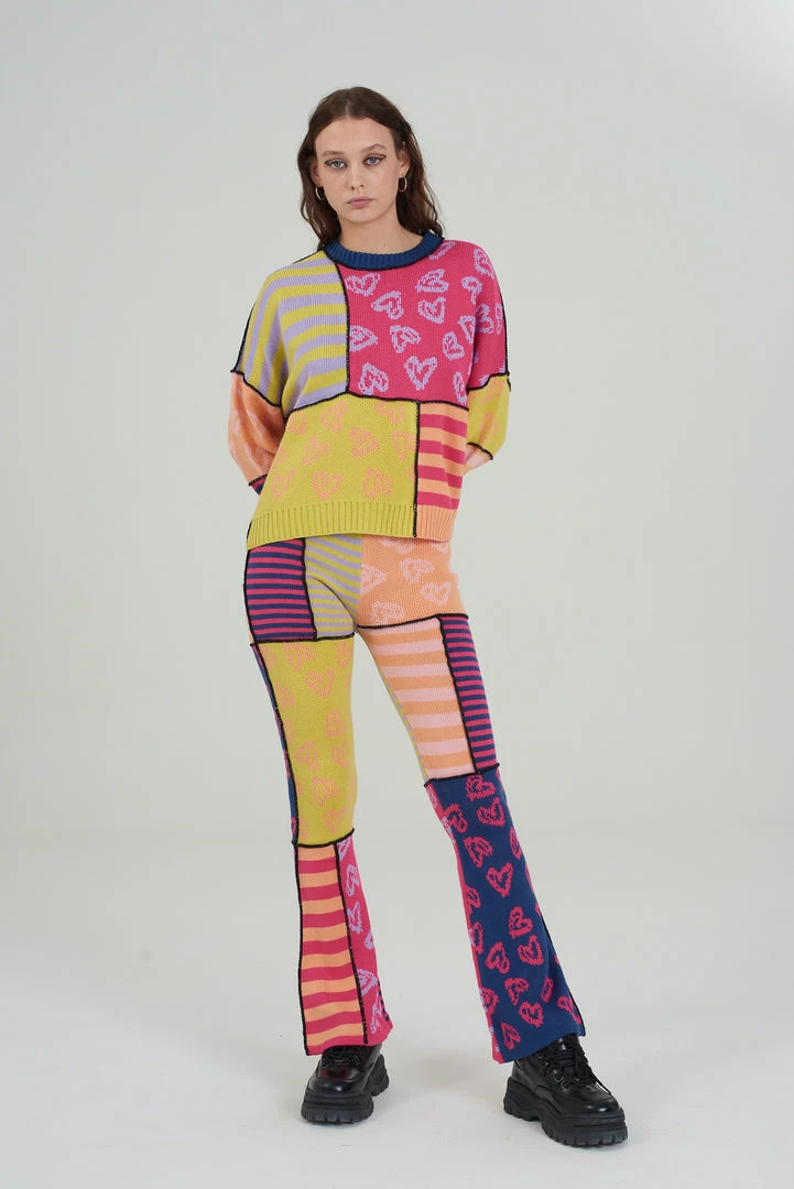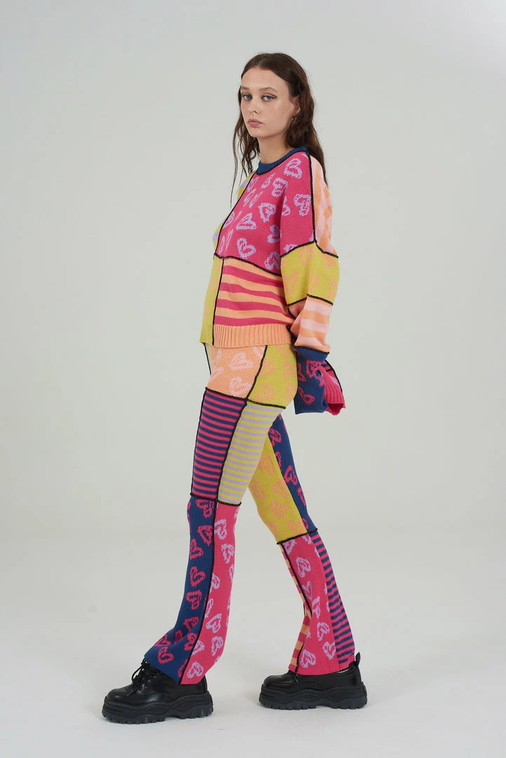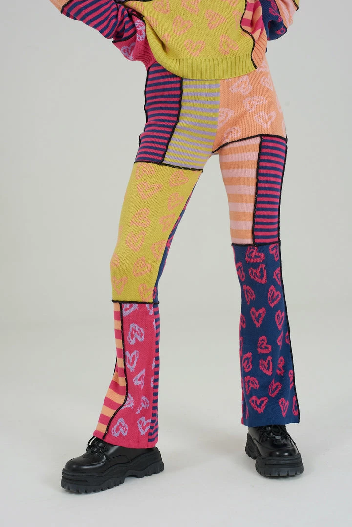 The Ragged Priest multicoloured patchwork knitted flares.