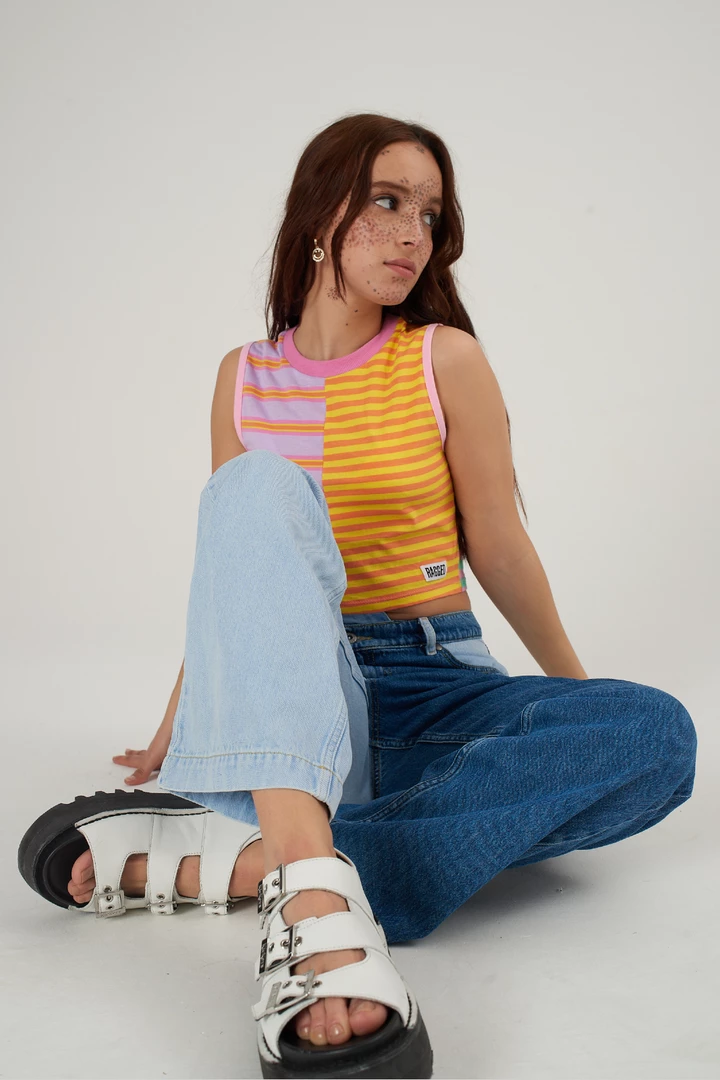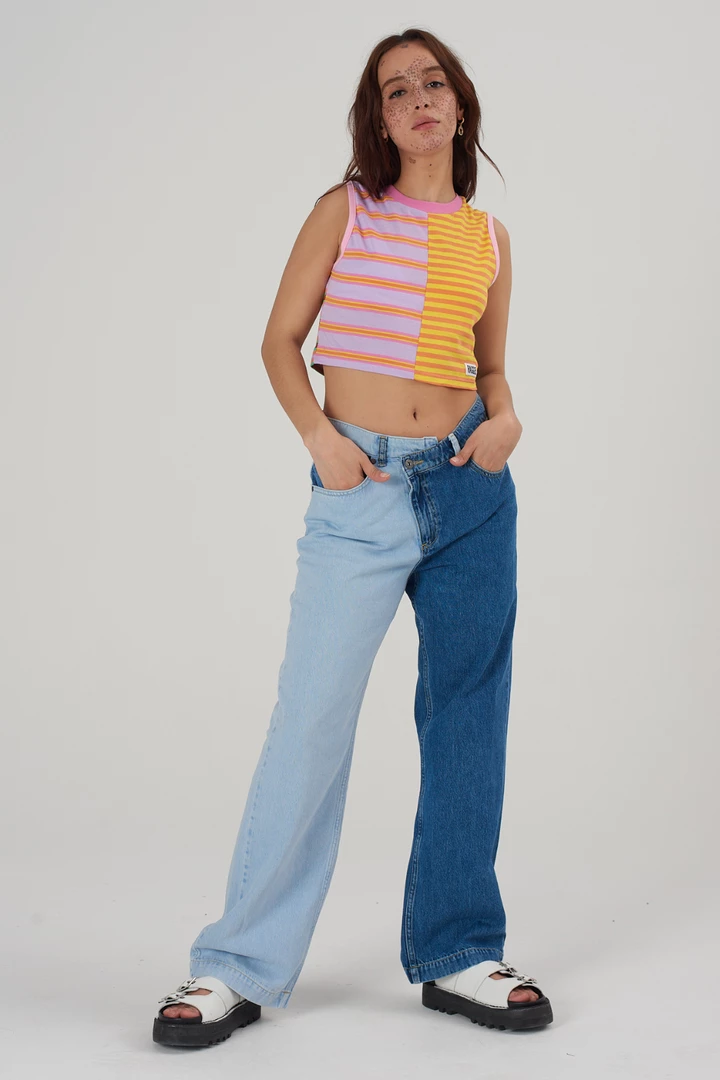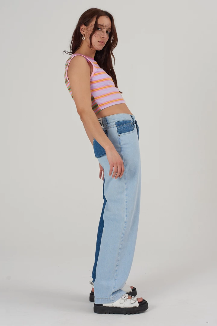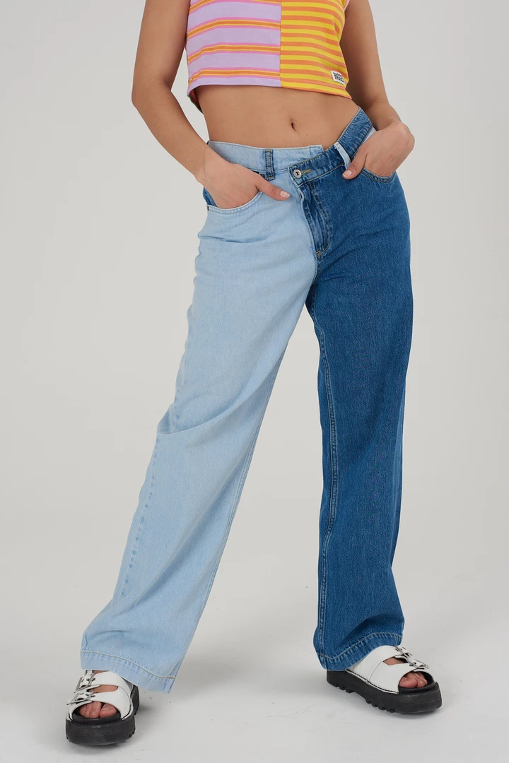 Ragged Jeans mixed blue half & half dad jeans with twisted waist detail.