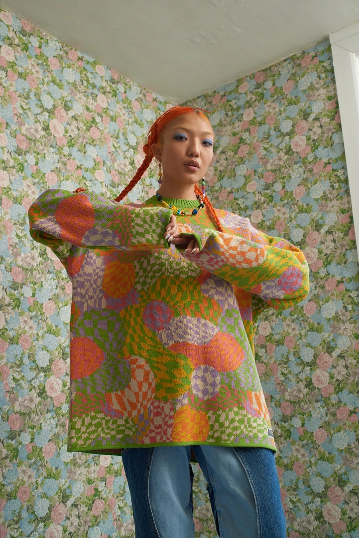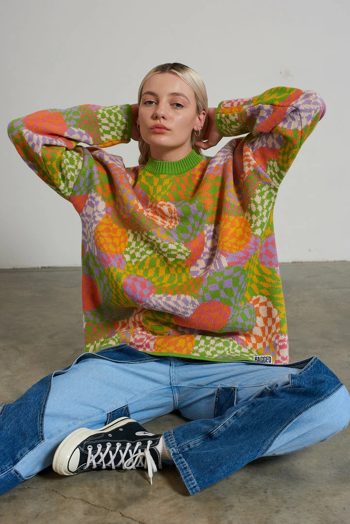 Ragged Jeans psychedelic jacquard knit jumper with green trims.