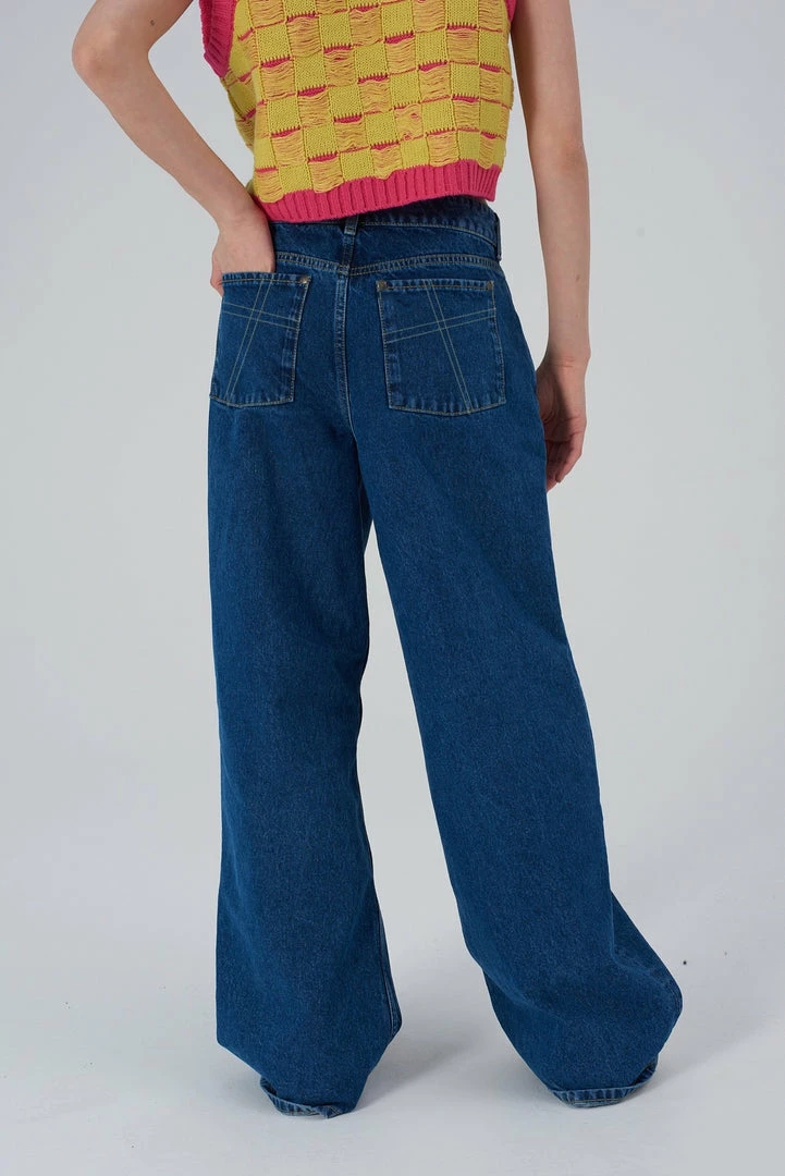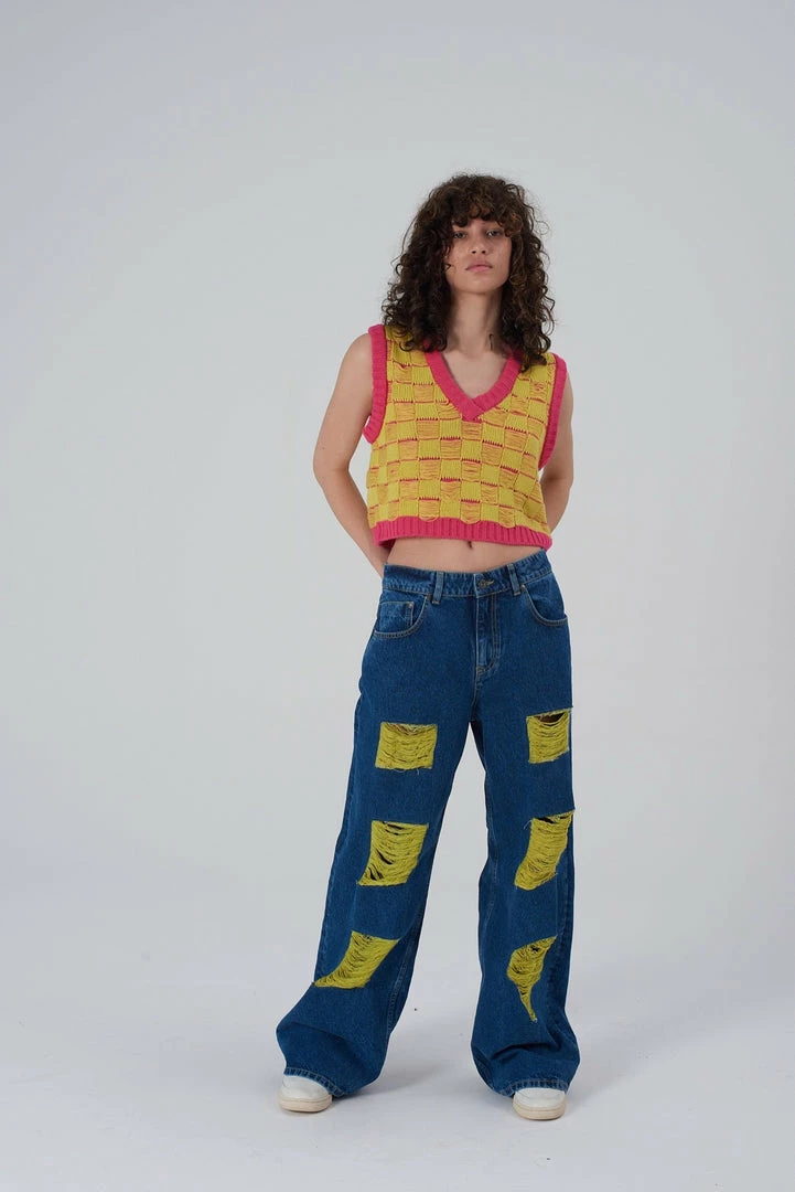 Ragged Jeans blue baggy skater style low-rise jeans with yellow fray patches.