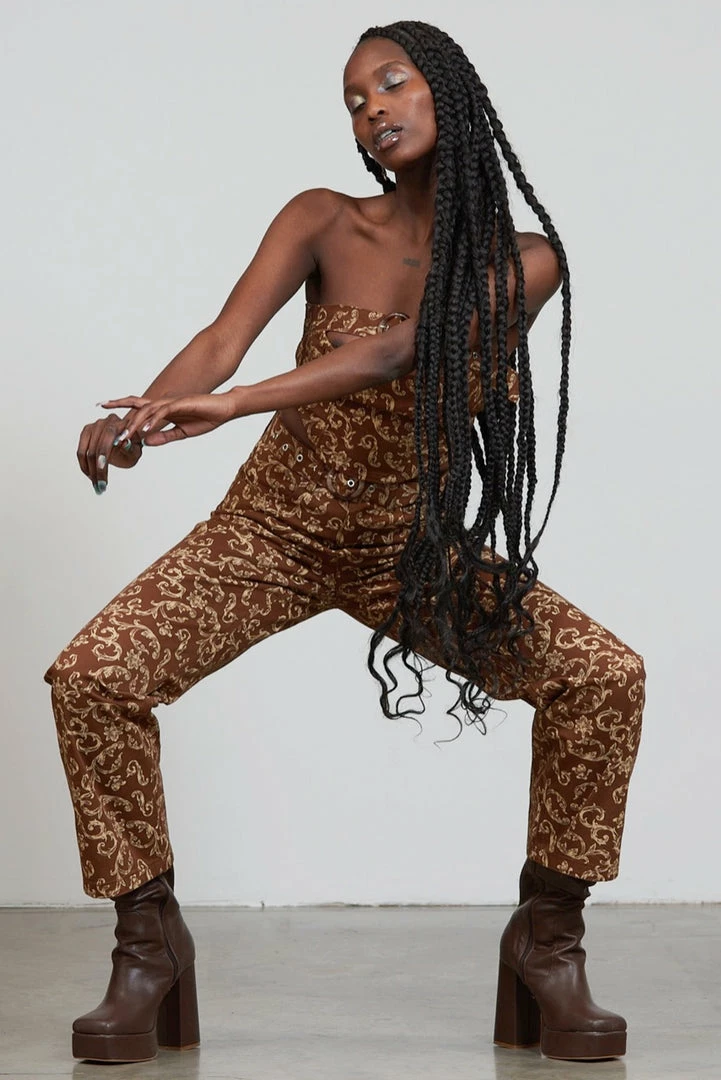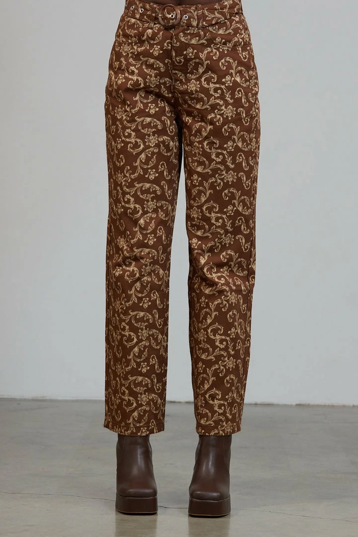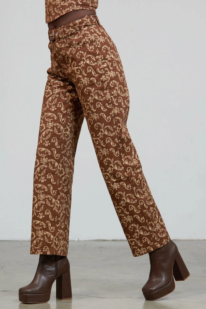 The Glitch Pant are our brown statement print pants with filigree design. Crafted from 50% recycled cotton these jeans feature a buckle belt detail and two tone design.