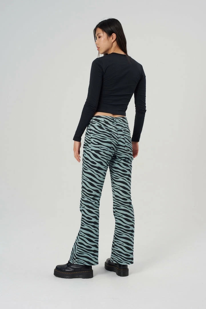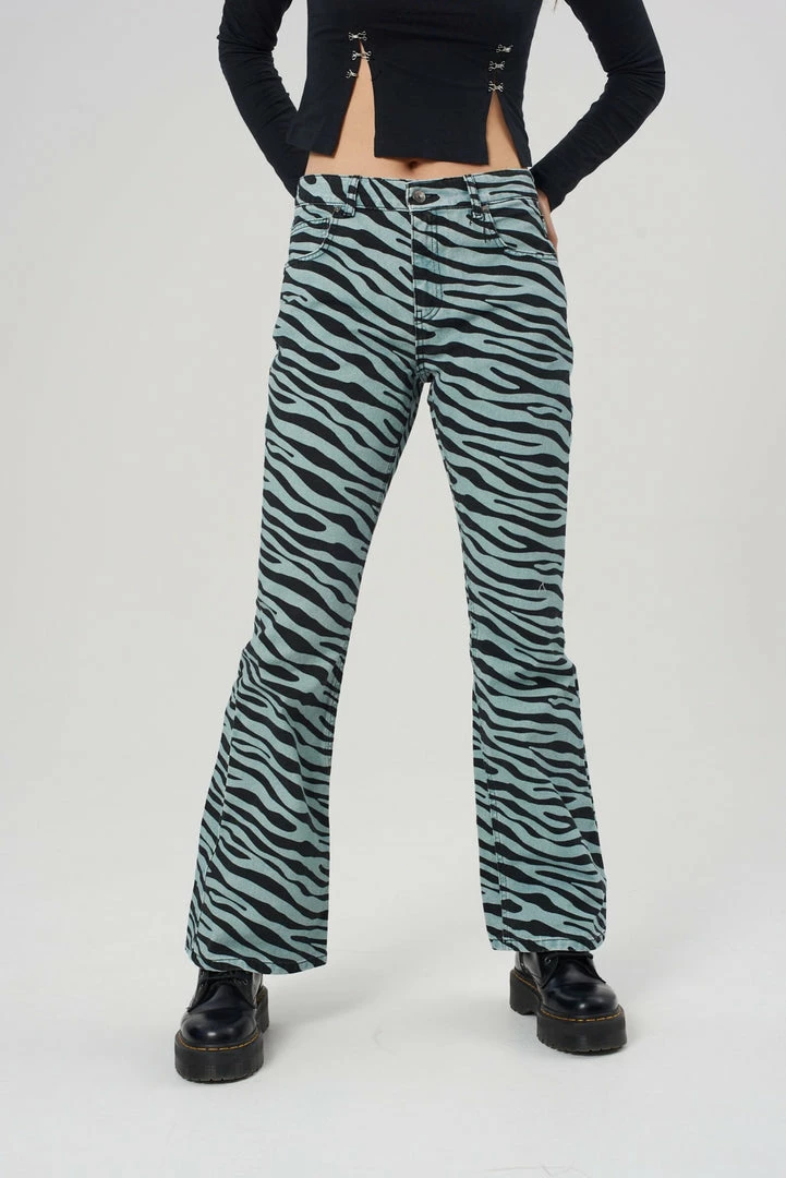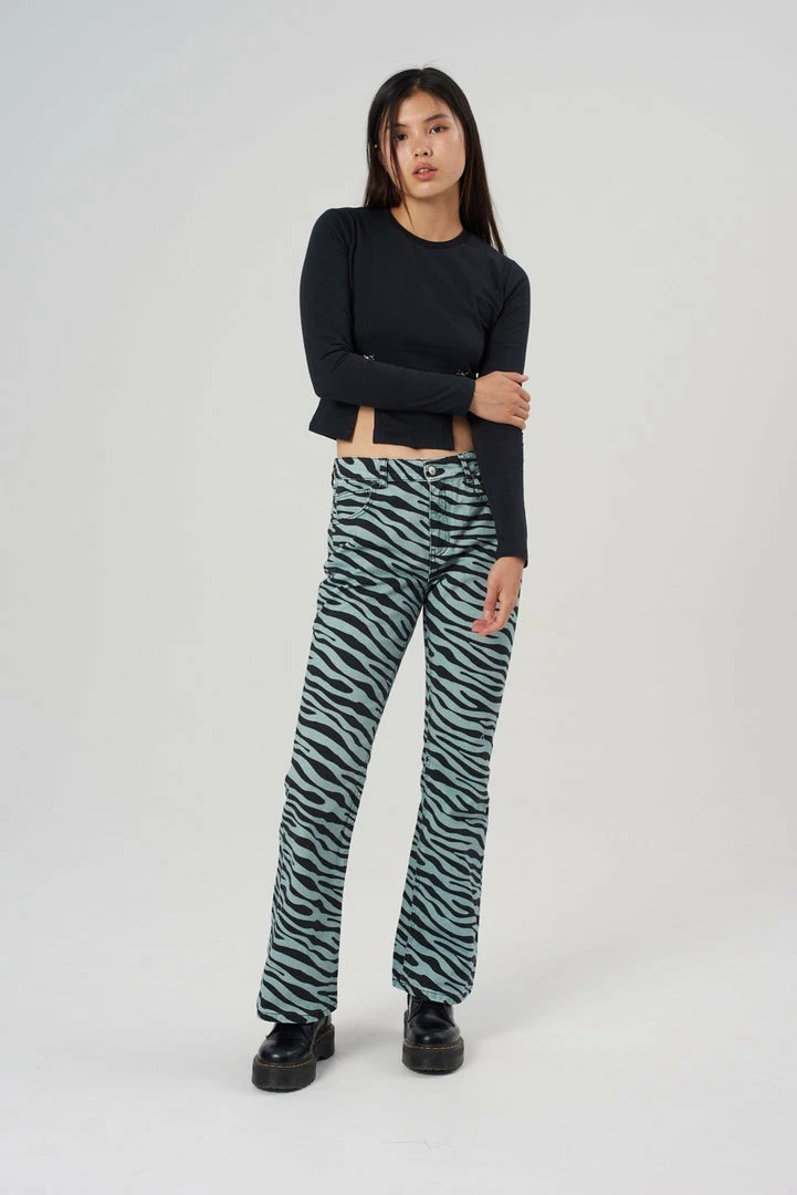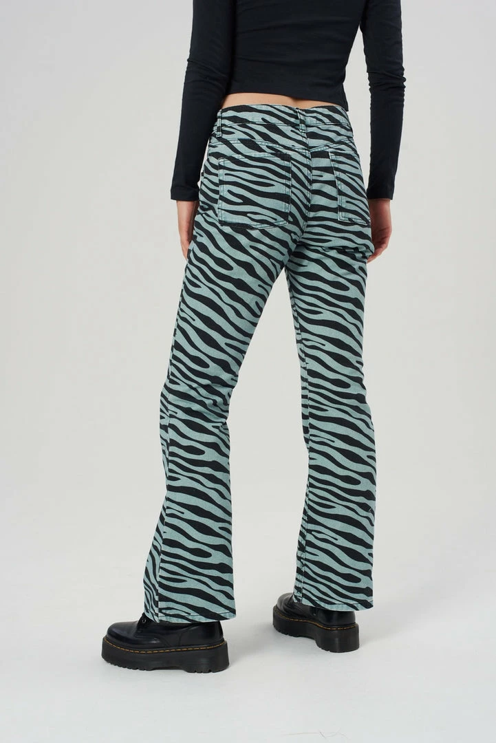 The Wild Jeans are our blue tiger print denim flared jeans. Crafted from 100% organic cotton.