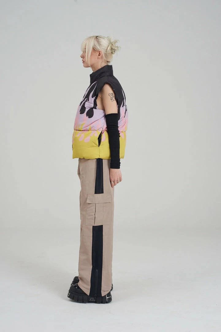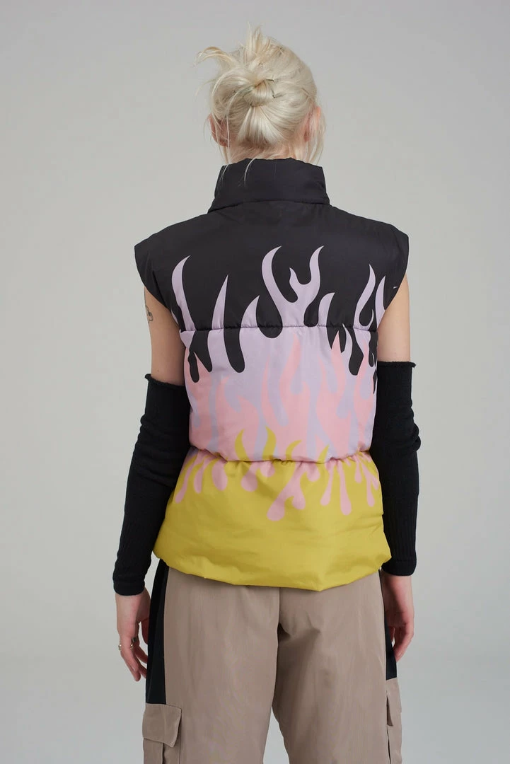 The Ragged Priest black puffer gilet / body warmer with flame print.