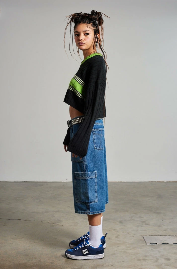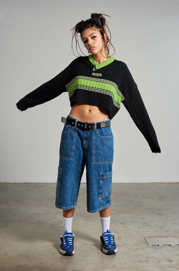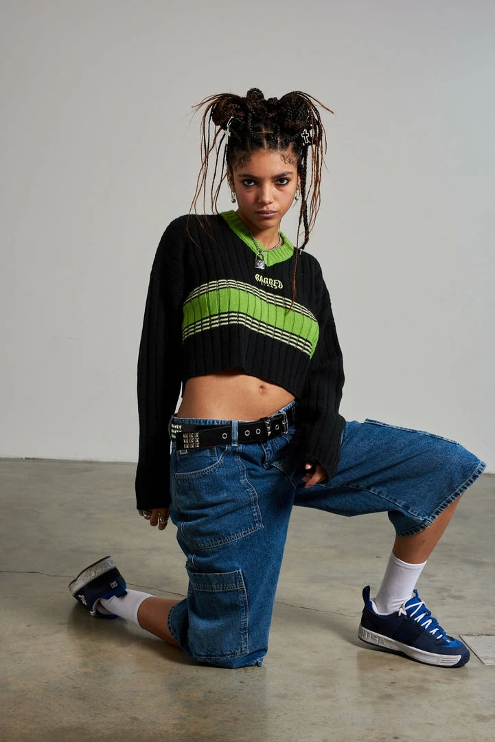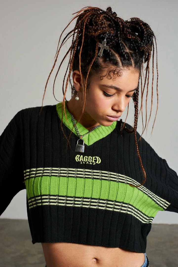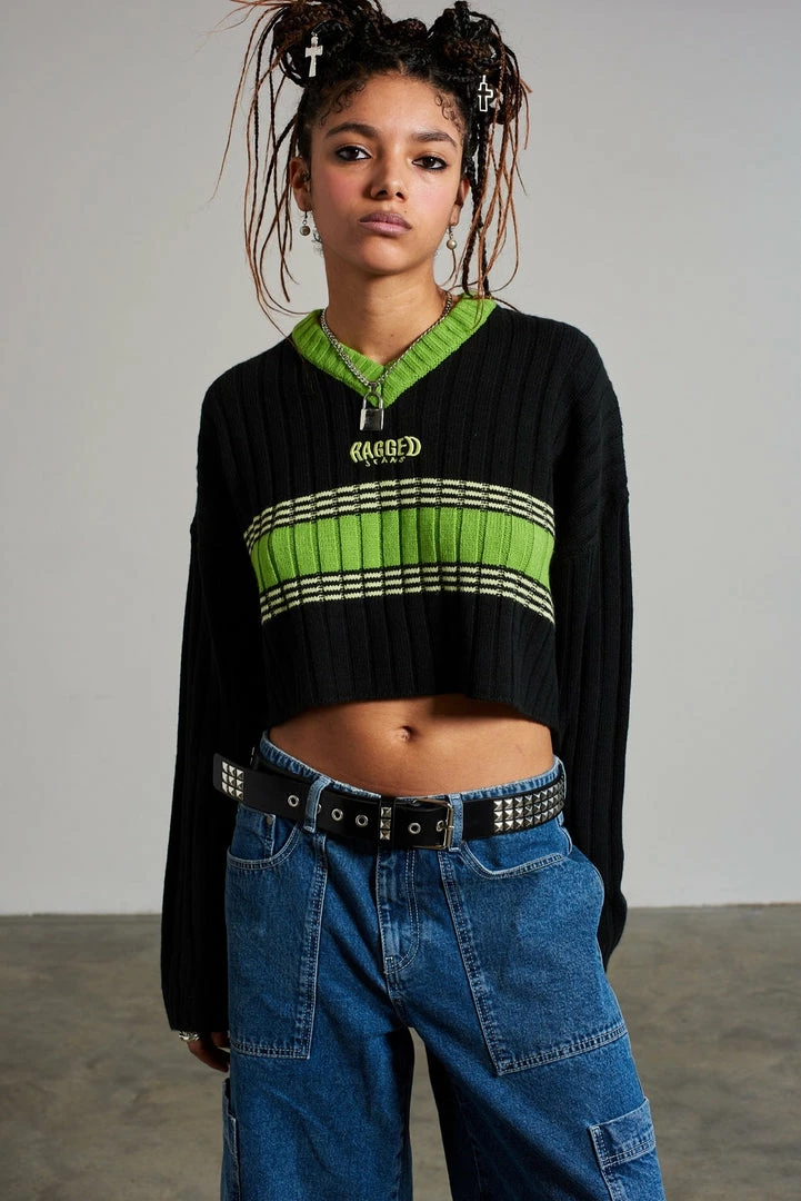 Ragged Jeans black v-neck knitted cropped jumper with green stripe and embroidered ‘Ragged Jeans’ logo.